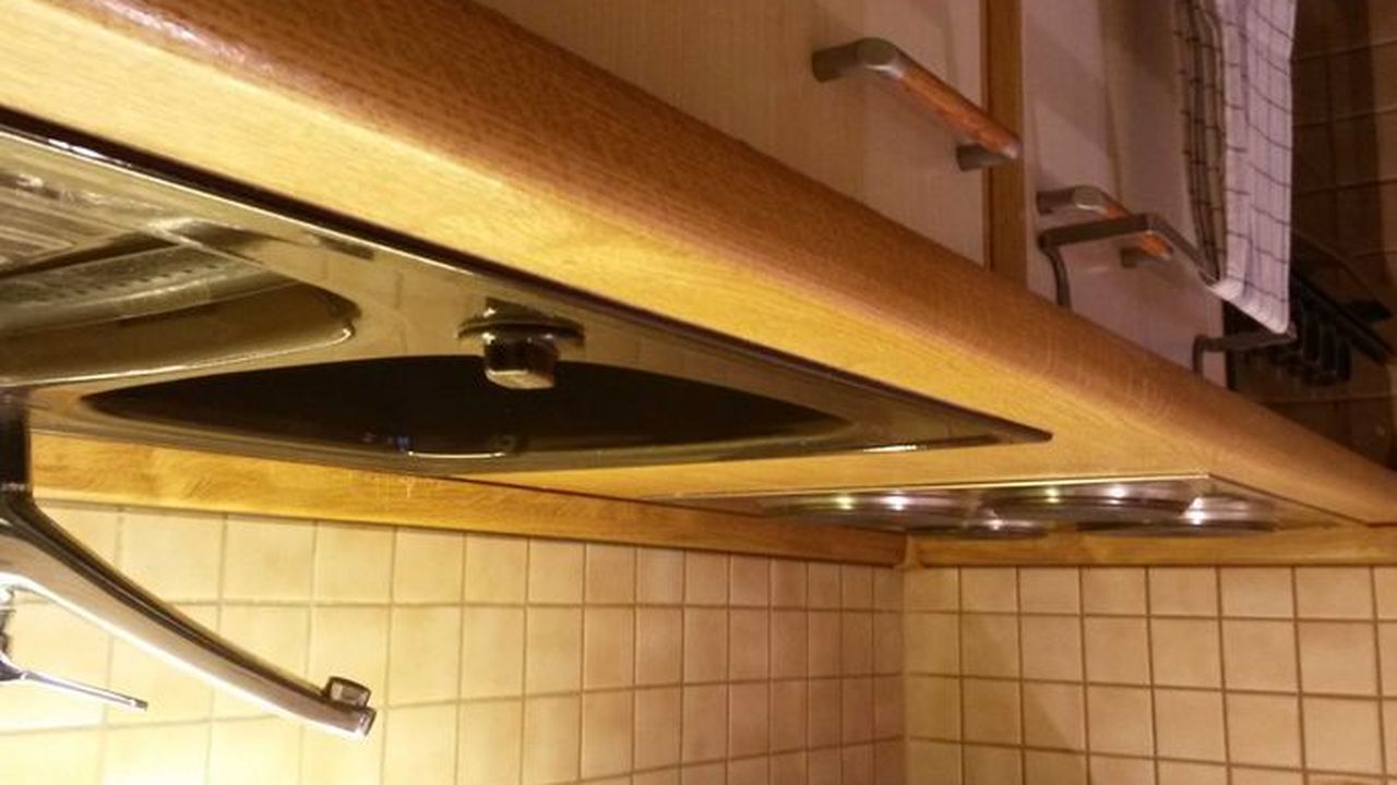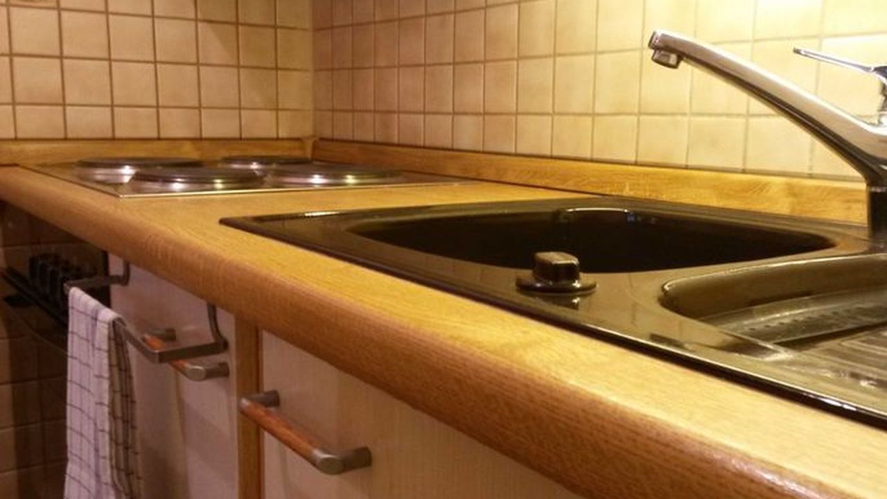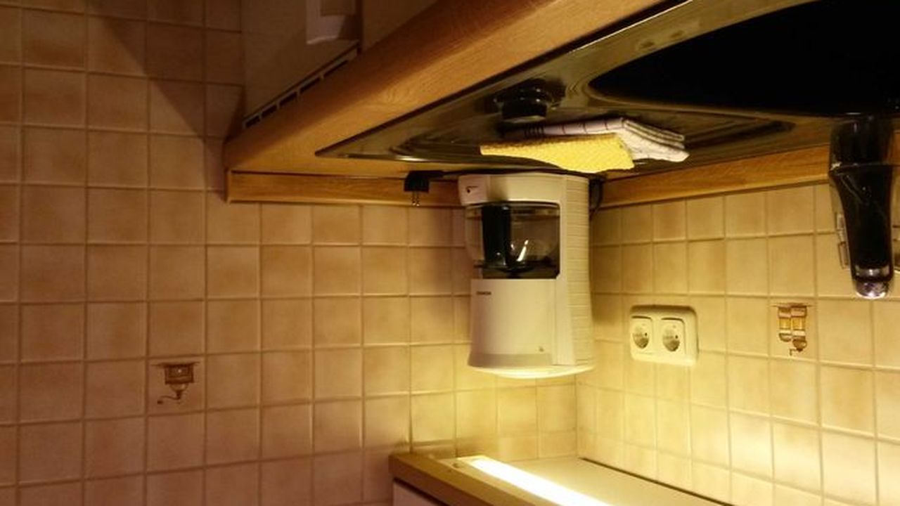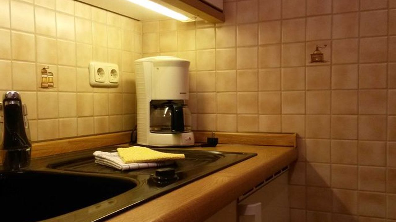 Die Küche verfügt über einen 4-Plattenherd mit Dunstabzugshaube, Backofen, Kühlschrank, Wasserkocher, Kaffeemaschine.