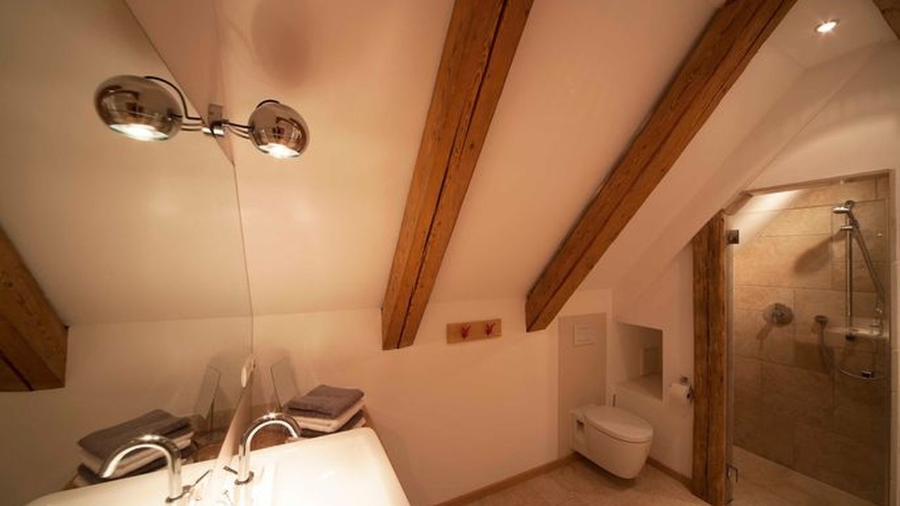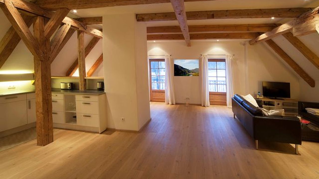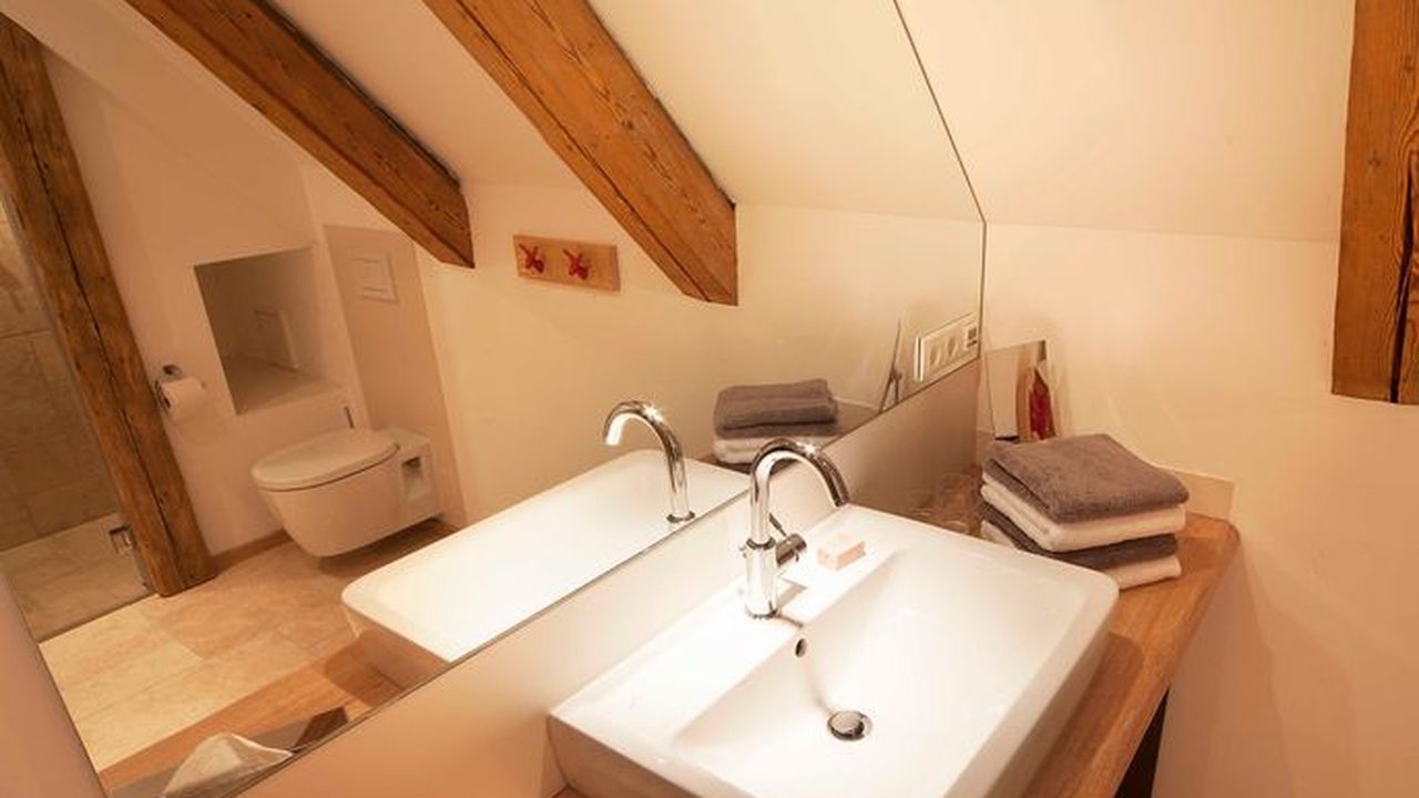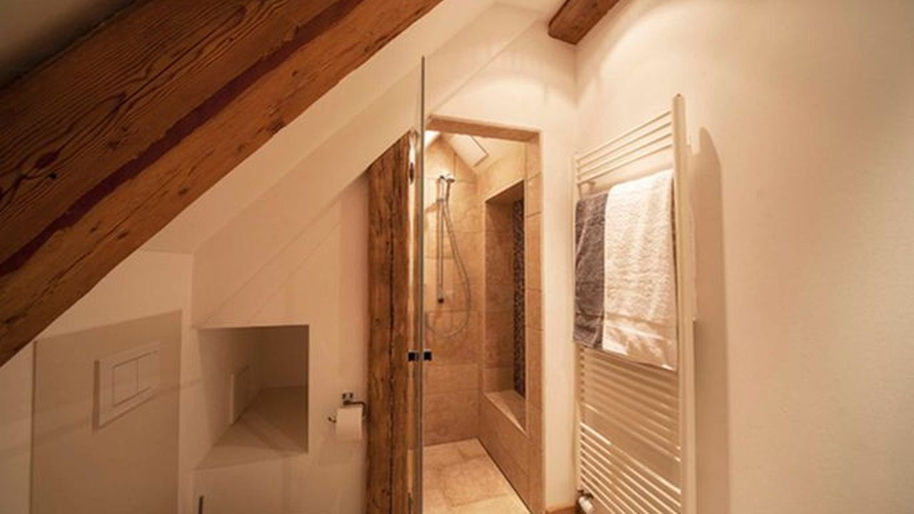 Ländlich moderne Ferienwohnung, mit gehobener Ausstattung. Eichendielenboden, hohe Räume mit sichtbarem alten Dachstuhl. Bad mit hochwertigem Naturstein. LED-backlight TV 40', Musikanlage, Filterkaffeemaschine. Gemütliche Schlafzimmer unter dem Giebel über freikragende Holztreppe zu erreichen, Maisonettewohnung. Doppelbett 1,80 x 2.00 m - im zweiten Schlafraum 1,60 x 2,00 m. Der Südbalkon mit Deckchair lädt ein zum Sonne tanken und verweilen.