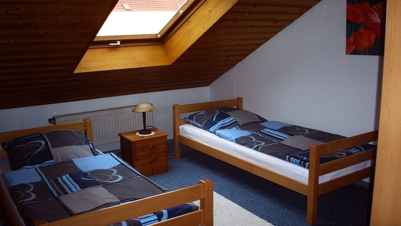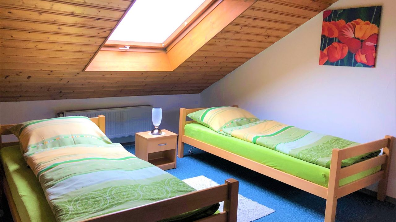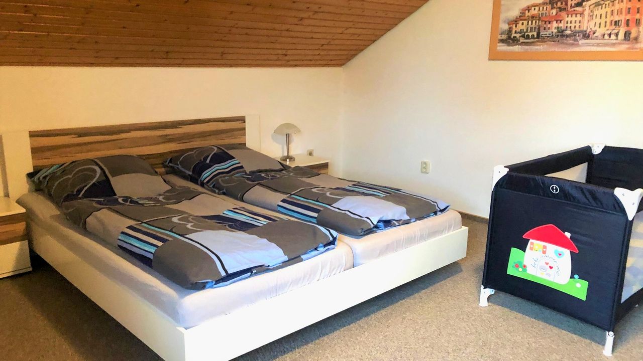 Schlafzimmer mit zwei Betten (plus Kinderbettchen möglich) mit Spiegelschrank.