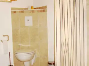 Im Bad mit Fenster befinden sich eine Dusche und ein WC.