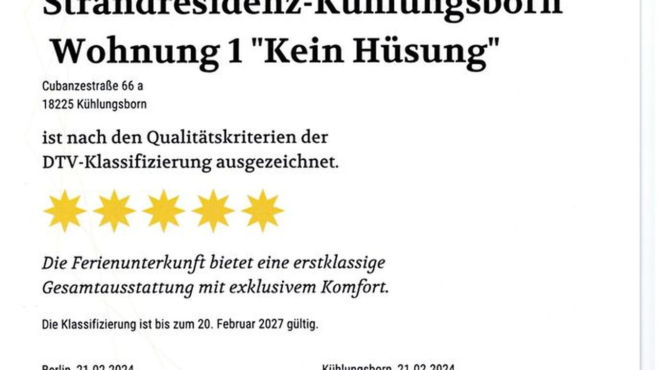 Die 7 Wohnungen gehören zu den Flaggschiffen der vom DTV zertifizierten deutschen Ferienwohnungen mit 1.216 bis zu 1.331 vergebenen Punkten. 5 Sterne gibt es ab 900 Punkte.