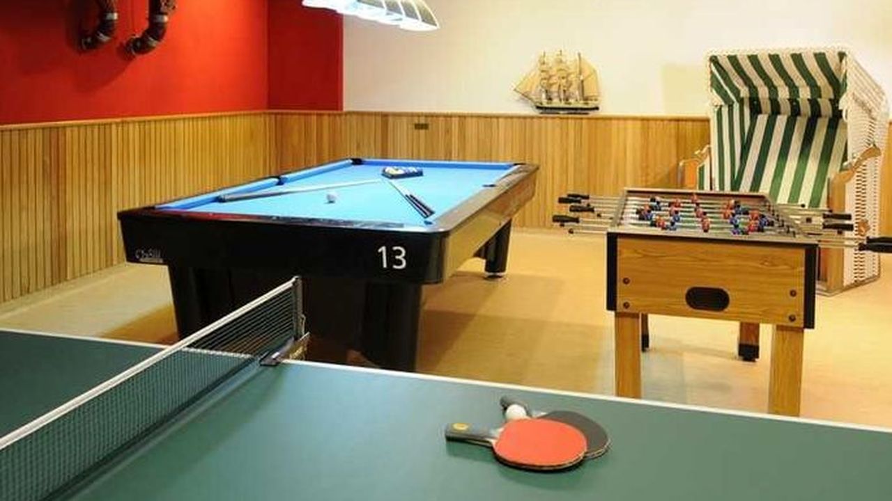 Freizeitraum mit Poolbilard (Turniertisch), Tischtennis, Tischkicker, Dartscheibe, Indoor-Torwand, Geselschaftsspiele und Spielzeug
