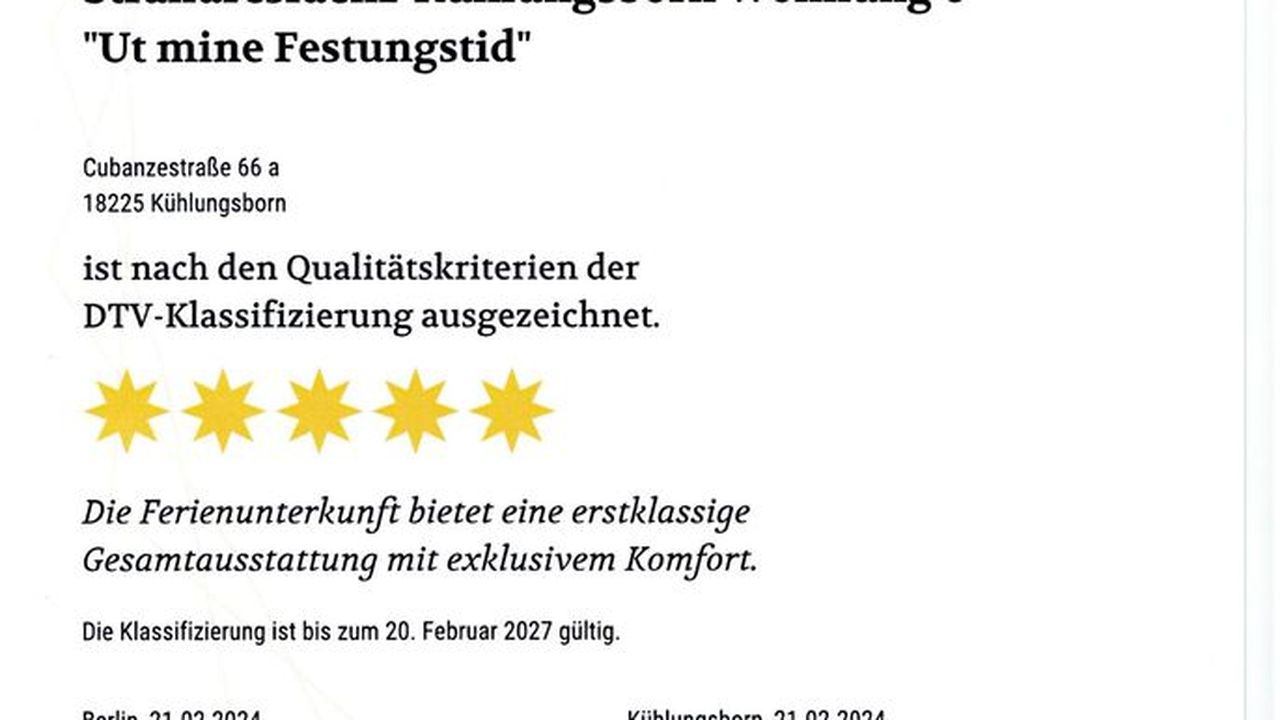 Die 7 Wohnungen gehören zu den Flaggschiffen der vom DTV zertifizierten deutschen Ferienwohnungen mit 1.216 bis zu 1.331 vergebenen Punkten. 5 Sterne gibt es ab 900 Punkte.