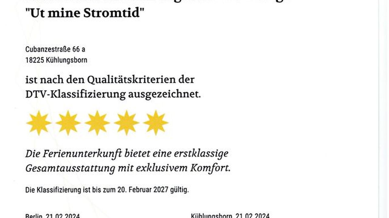 Die 7 Wohnungen gehören zu den Flaggschiffen der vom DTV zertifizierten deutschen Ferienwohnungen mit 1.216 bis zu 1.331 vergebenen Punkten. 5 Sterne gibt es ab 900 Punkte.