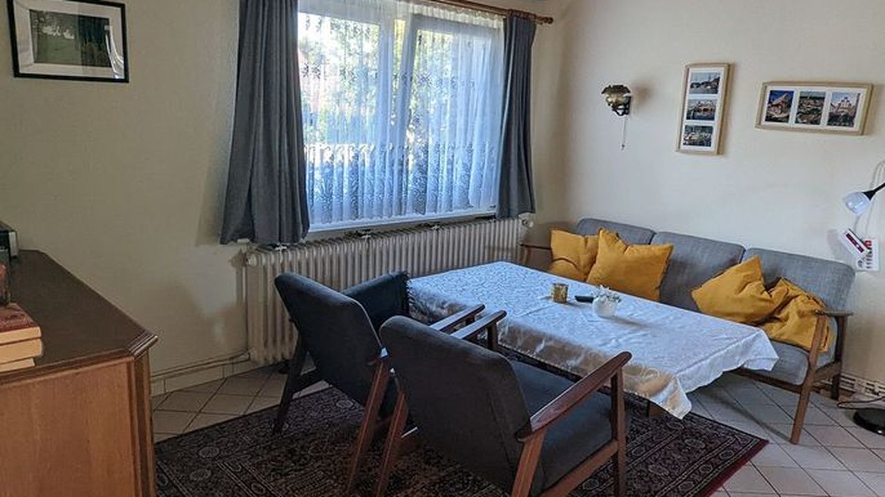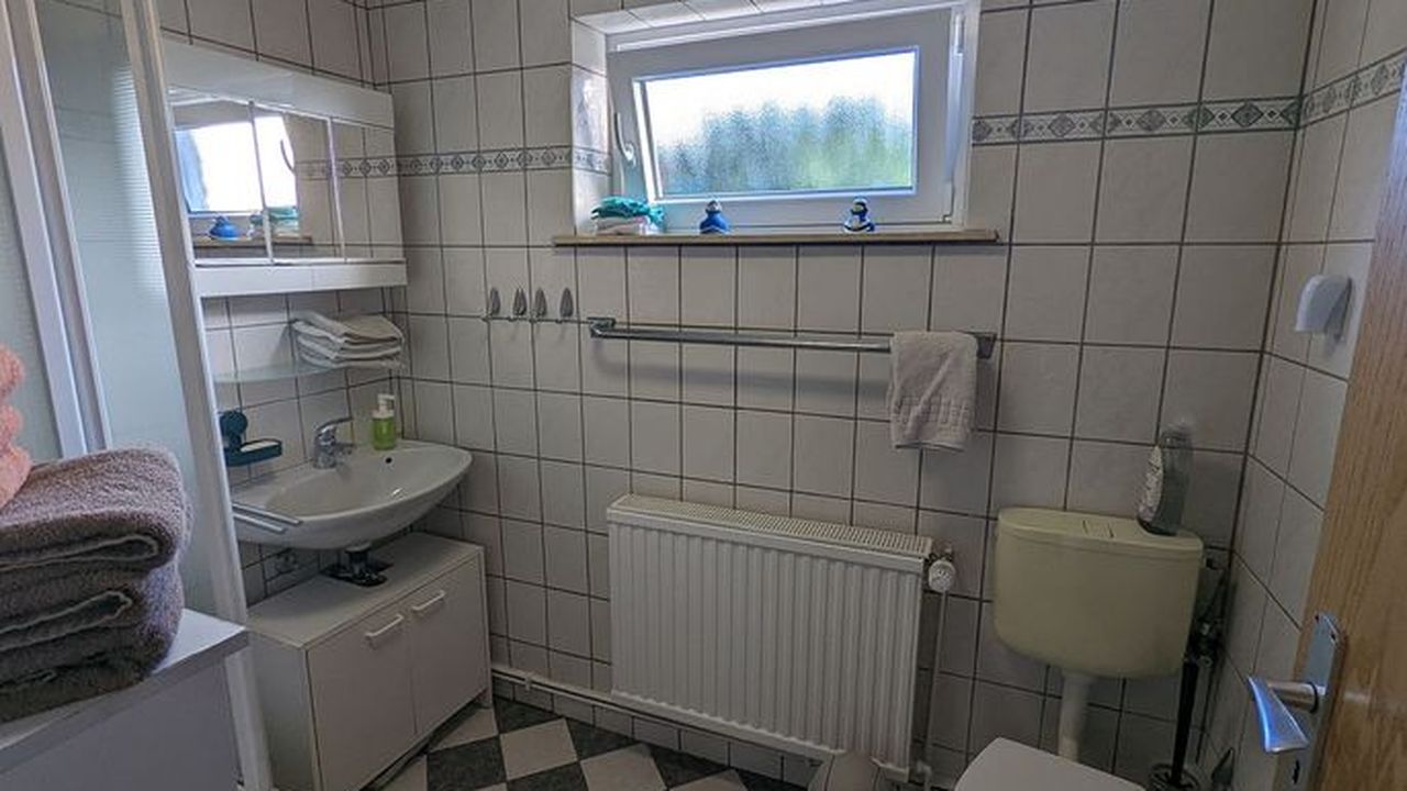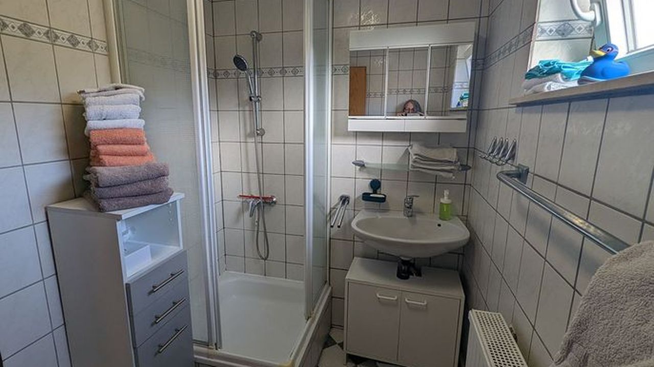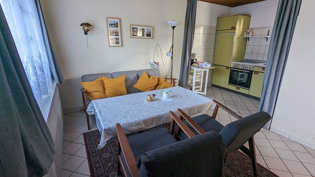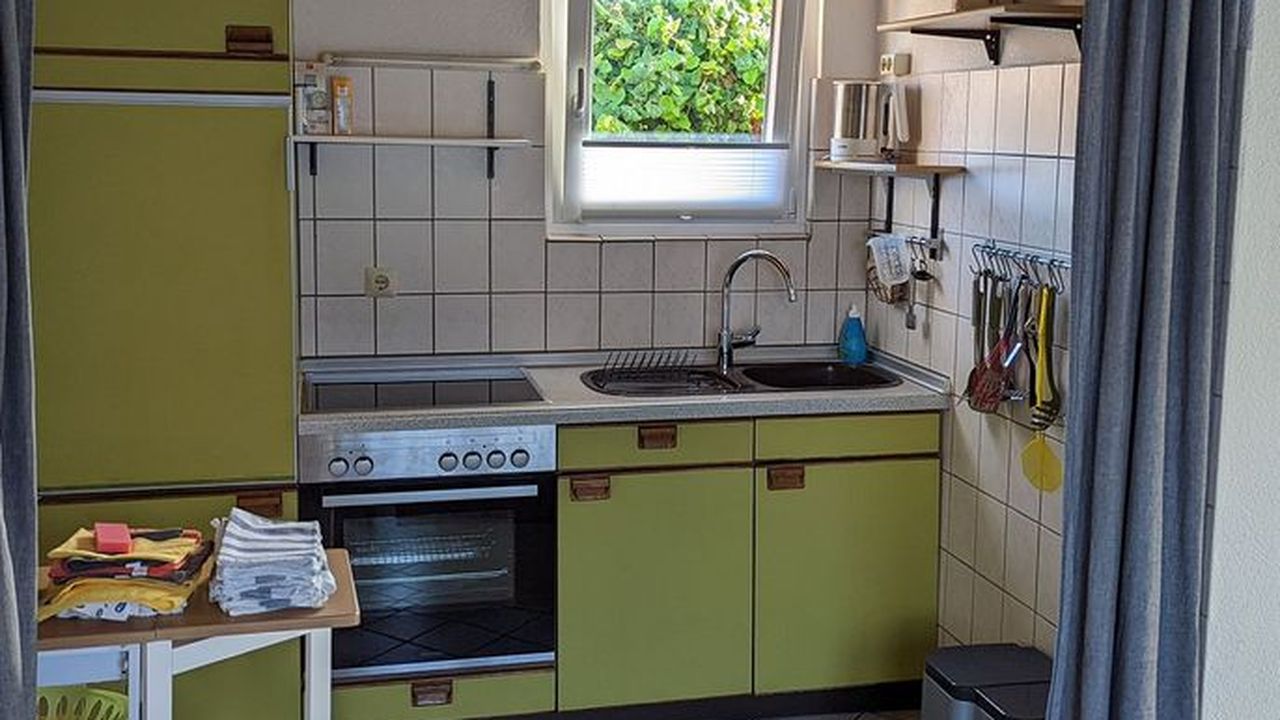 Die ca. 40 m² große Ferienwohnung mit Flur, Wohnzimmer, Duschbad/WC und zwei Schlafräumen ist für 3 Personen geeignet. Sie ist zentralbeheizt, die Böden sind gefliest, im Wohnzimmer liegt ein Teppich. Bad und Doppelzimmer grenzen an das Wohnzimmer. Durch das Doppelzimmer (Durchgangszimmer) erreicht man das zweite Schlafzimmer (Kinderzimmer). Im Kinderzimmer sind Teppichböden und ein Einzelbett (80x200 cm ausziehbar) . Handtücher, Küchentücher und Bettwäsche werden gestellt und wöchentlich gewechselt.Die Wohnung hat eine zum Wohnzimmer hin offene farbige Einbauküche mit Backofen, Cerankochfeld, Spüle und Einbaukühlschrank mit Gefrierfach. Kaffeemaschine, Wasserkocher, Eierkocher und Toaster sind vorhanden. Geschirr, Besteck, Gläser, Kochtöpfe etc. sind für 8 Personen vorhanden.