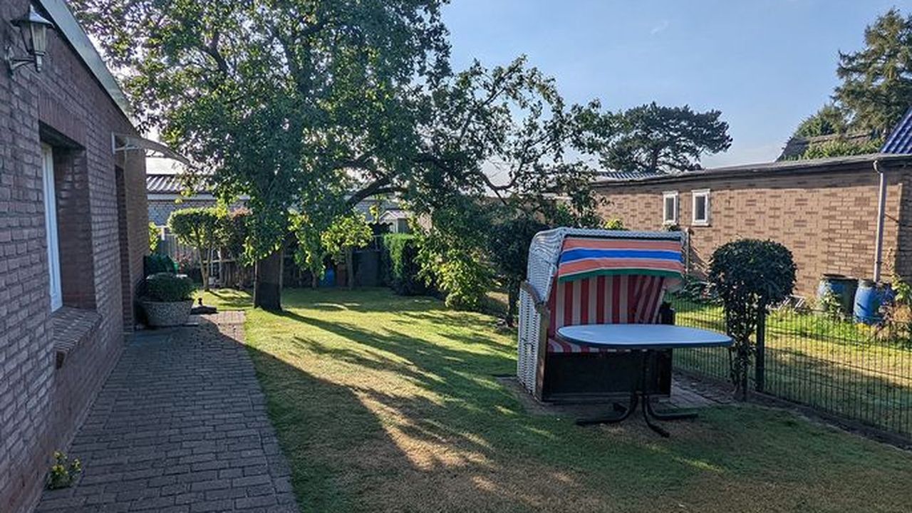 Der große Garten mit Gartenmöbeln und Strandkorb lädt zum Verweilen ein.