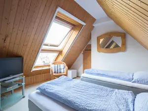 DG: Ein Schlafraum mit zwei nagelneuen Boxspringbetten, Kinderbett auf Wunsch. Sehr geschmackvolle Ausstattung mit Sat-TV, Video, DVD/CD-Player und Musikanlage. Bettwäsche/Handtücher inklusive.