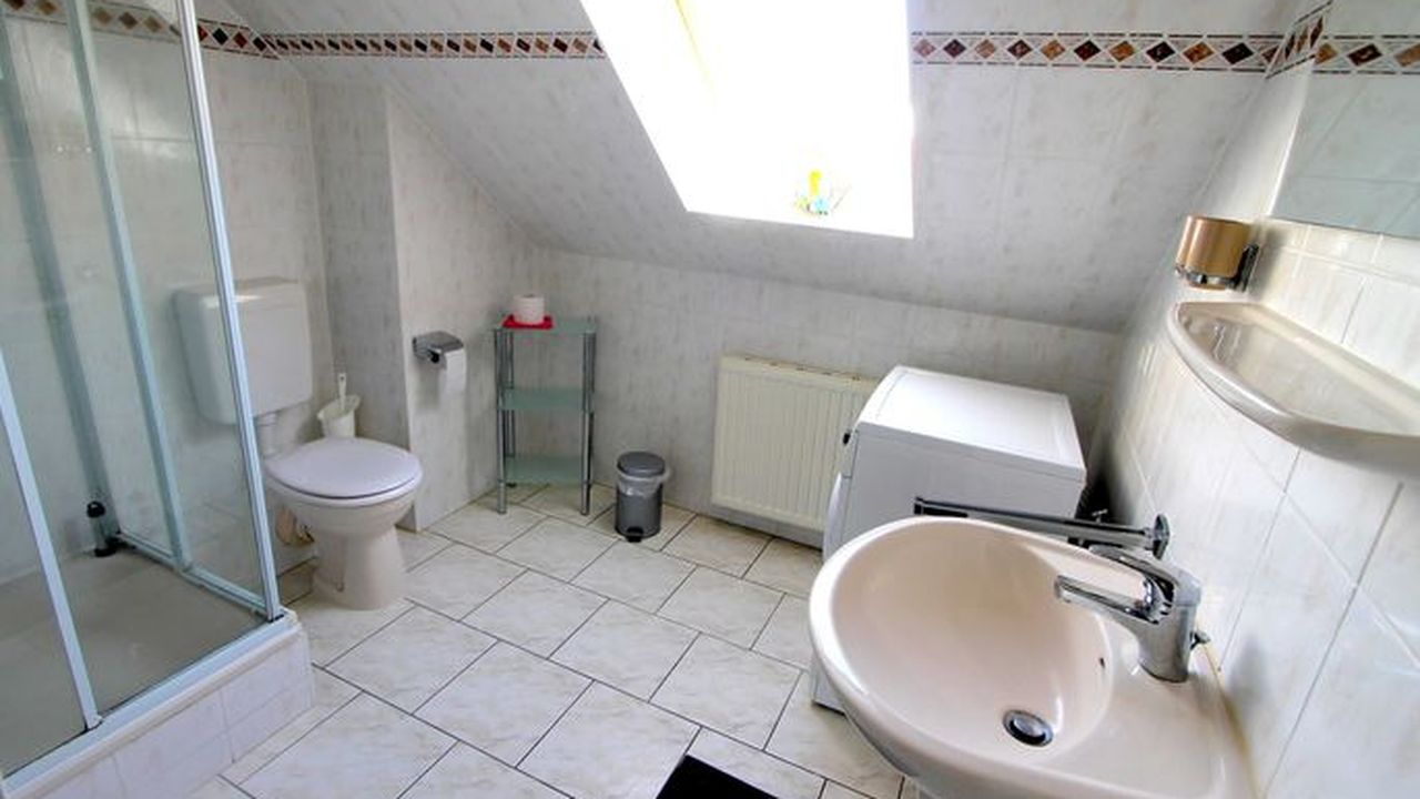Ebenfalls im Obergeschoss befindet sich das Badezimmer mit Dusche, WC.