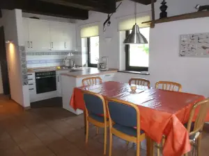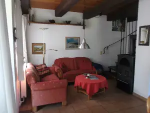 Das festgemauerte Haus (120 m²) liegt in einem großen Garten mit einem kleinen Teich und bietet Platz für 6 Personen. Das Haus ist aufgeteilt in einen Wohnraum mit offener Küchenzeile, vier Schlafräumen und zwei Badezimmern. Der gemütliche Wohnraum ist mit einer Sitzecke, einem TV-Gerät (Flachbildschirm), einer Stereo-Anlage und einem dänischen Kaminofen eingerichtet. Direkt angrenzend ist die offene Küchenzeile mit einem Herd mit Cerankochfeld und Backofen, einem Kühlschrank mit Gefrierfach, Spülmaschine, Wasserkocher, Toaster und Kaffeemaschine und einem Essplatz. Im Erdgeschoß befinden sich zwei Schlafräume: 1 Schlafraum mit einem Doppelbett (1,80 m x 2,00 m), einem Kleiderschrank und einem TV-Gerät sowie direkt angrenzendem Badezimmer mit Dusche und WC. Ein zweiter Schlafraum ist mit einem Einzelbett (0,90 m x 1,90 m) und einem Kleiderschrank ausgestattet. Im Erdgeschoß befindet sich ein weiteres Badezimmer mit Dusche und WC. Im Obergeschoß ist ein weiterer Schlafraum mit einem Doppelbett (1,80 m x 2,00 m) und einem Kleiderschrank sowie ein offener Schlafraum mit zwei Einzelbetten und einem großen Tisch mit Stühlen, der sich zum Spiele spielen eignet. Weitere Angaben: W-LAN. Bettwäsche, Handtücher und Endreinigung im Preis inklusive.