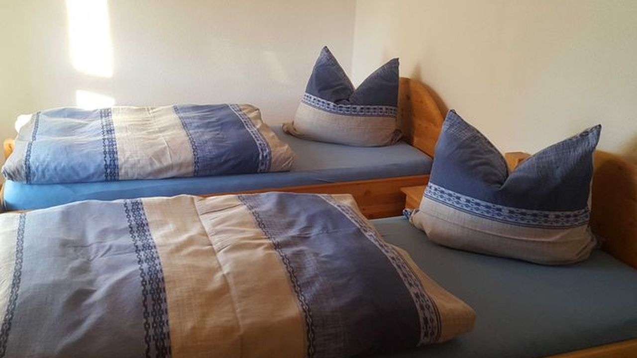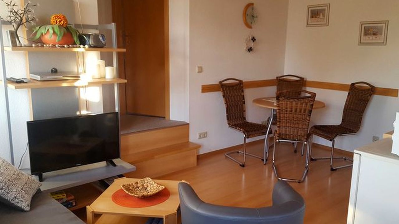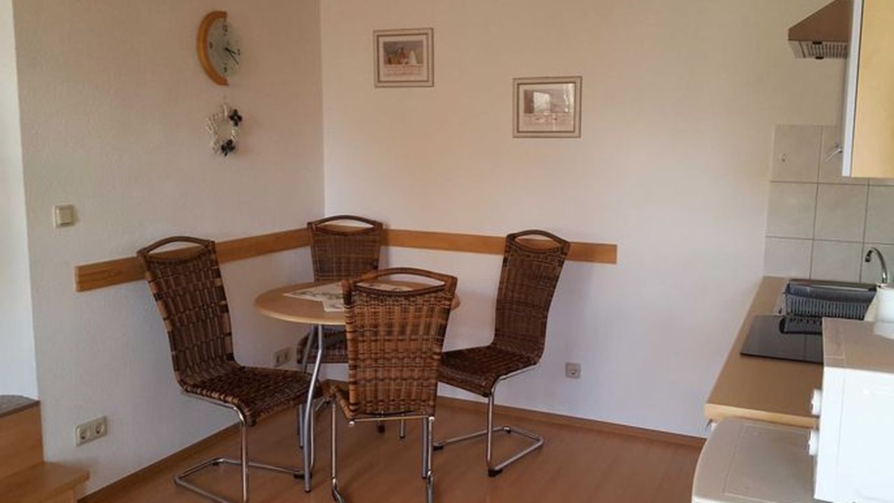 Die Ferienwohnung ist eine 3-Raumwohnung im 1. Obergeschoss mit einem Wohnzimmer, offener Küche mit Mikrowelle, Geschirrspüler und einem Esstisch. Vom Wohnzimmer aus gelangen Sie auf den Balkon. Über zwei Stufen erreichen Sie die 2 Schlafzimmer mit einem Doppelbett bzw. 2 Einzelbetten. Desweiteren ist noch Platz für 1 Kind bis 3 Jahre im Kinderreisebett. Das Bad verfügt über eine Dusche und ein WC, sowie einem Waschplatz. Angeboten wird WLAN über HOT Spot. Die Wohnung ist eine Nichtraucherwohnung. Ein Bügelbrett gehört ebenfalls zur Ausstattung der Wohnung.Sonstiges