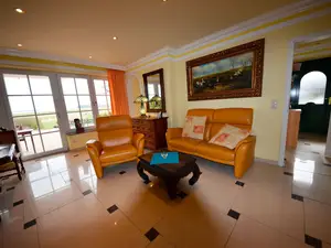 Großzügiges Wohn-Esszimmer mit Ausgang zur großen 80m²-Terrasse. Schöne Ledergarnitur mit Opiumtisch, große Fensterfronten mit direktem Blick auf die Ostsee, den kleinen Hafen von Groß Zicker und die gegenüber der Bucht liegenden Orte Thiessow und Klein Zicker. Antiker Esstisch mit 4 Stühlen, großer Hark-Kaminofen, Gläserschrank, antike Vitrine, kleine Bücherauswahl, Plasma-TV 50" mit 125 cm Großbild, Fußbodenheizung, DVD - Recorder, Stereoanlage, CD-Player, Kinderhochstuhl, Wände dekoriert mit Spiegeln und Gemälden, sehr ansprechende Beleuchtung.