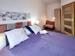 .Im Schlafzimmer, dessen Fenster nach Westen zeigt, gibt es ein bequemes kontinentales Doppelbett (2x70 cm) mit der Möglichkeit, die Matratzen auszuziehen, ein ausziehbares Einzelsofa (90 x 195 cm) und einen Kleiderschrank.
