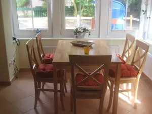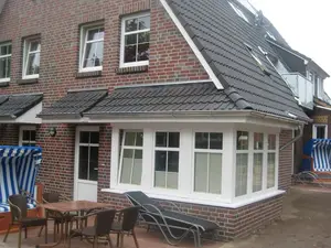 Die 59m² große Maisonette-Wohnung ist eine komplette Haushälfte und bietet genug Platz für 1-4 Personen. Das Erdgeschoss beherbergt eine große Wohnküche mit Essecke. Diese befindet sich in einem lichtdurchfluteten Fenstervorsprung, der eine tolle Aussicht in den Garten ermöglicht. Dieser ist mit einer Terrasse ausgestattet, auf der auch eine Sitzgruppe, Liegestühle und ein Strandkorb stehen. Im Obergeschoss befindet sich ein großes, helles Schlafzimmer mit großem Doppelbett. Der Raum ist groß genug um ein Kinderbett aufzustellen.. Das Tageslichtbad ist hell und modern eingerichtet.Sonstiges