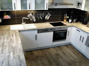 Der Eingangsflur, die Küche sowie Duschbad und separates WC sind mit hochwertigen Bodenfliesen in hochglanz-anthrazit ausgestattet. Die restlichen Bodenbeläge bestehen aus hochwertigem Laminat in Walnuss. Das Wohnzimmer lädt mit Ohrensessel und Relaxliege im Loungecharackter zum entspannten Lesen und Verweilen ein.