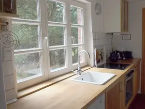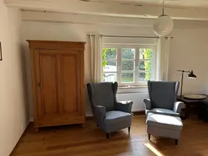 3-Raum-Ferienwohnung nach Süden und Westen für 1-4 Personen, 75 qm EG + DG. Im Erdgeschoß: Wohnzimmer mit Couch (Schlafsofa), 3 Sessel und Couchtisch, TV. Küche mit 4-Plattenherd, Backofen, Geschirrspülmaschine, Gefrierschrank, Kühlschrank, Spüle, Geschirr und Hausrat, Essecke mit großem Esstisch und Stühlen, Zugang in den Garten. Bad mit Dusche, WC und Waschbecken. Im Obergeschoss 2 Schlafzimmer und 1 Gäste-WC. Schlafzimmer I: Ehebett , Nachttische, Kleiderschrank, Schlafzimmer II: 2 Einzelbetten je 90x200, Nachttisch, Kleiderschrank. Gäste-WC mit Waschbecken. Fußbodenbelag: in den Wohn- u. Schlafbereichen Holzdielen, in Küche, Bad und Gäste-WC Fliesenboden. Kinderreisebettchen und -hochstuhl sind vorhanden. WLAN wird als kostenloser Service angeboten - eine Gewähr auf Verfügbarkeit besteht nicht.Verfügbare Zusatzleistungen