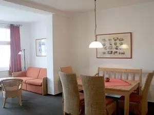Der großzügige Essbereich bietet ebenso viel Platz zum Beisammensein wie der lichtdurchflutete Wohnbereich vor den großen Jugendstilfenstern (ausziehbare Doppelbettcouch, HiFi-Anlage, großer Flachbildschirm, WLAN bei Bedarf).