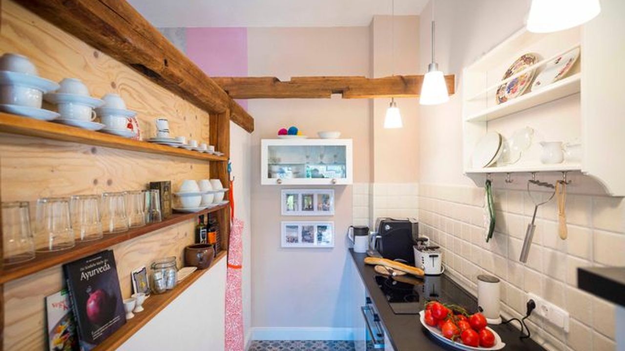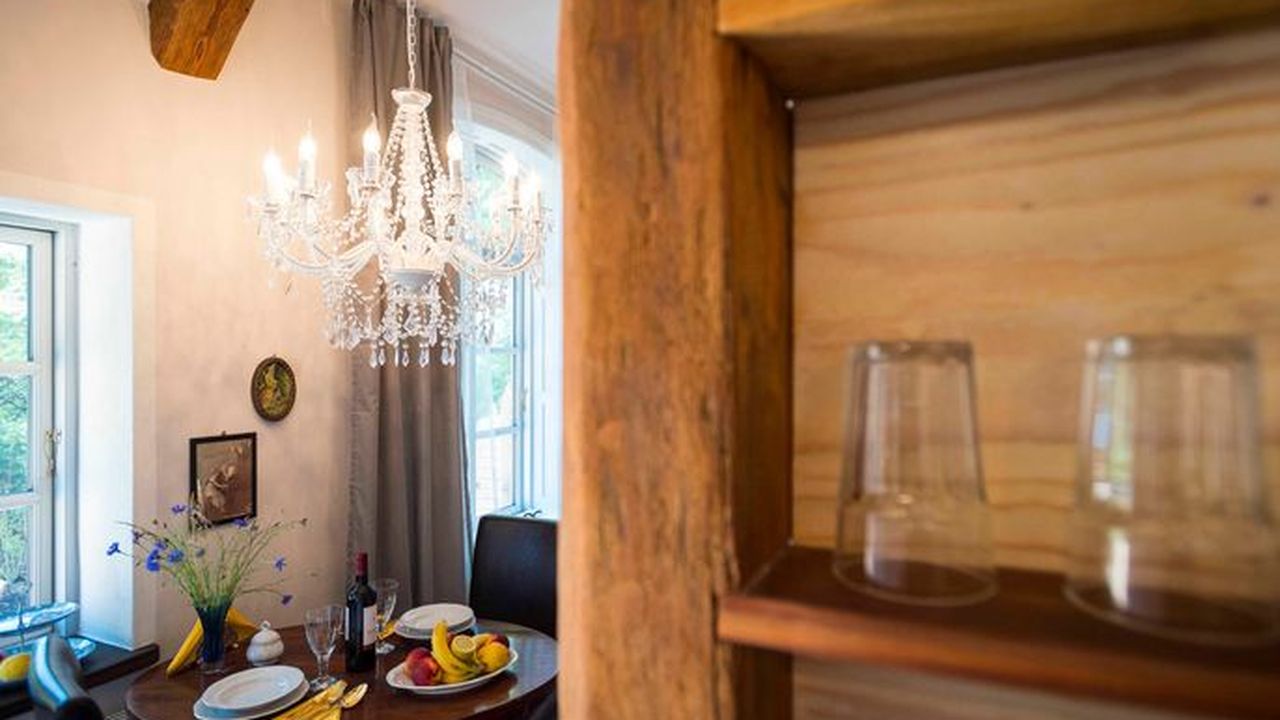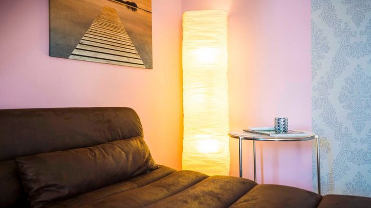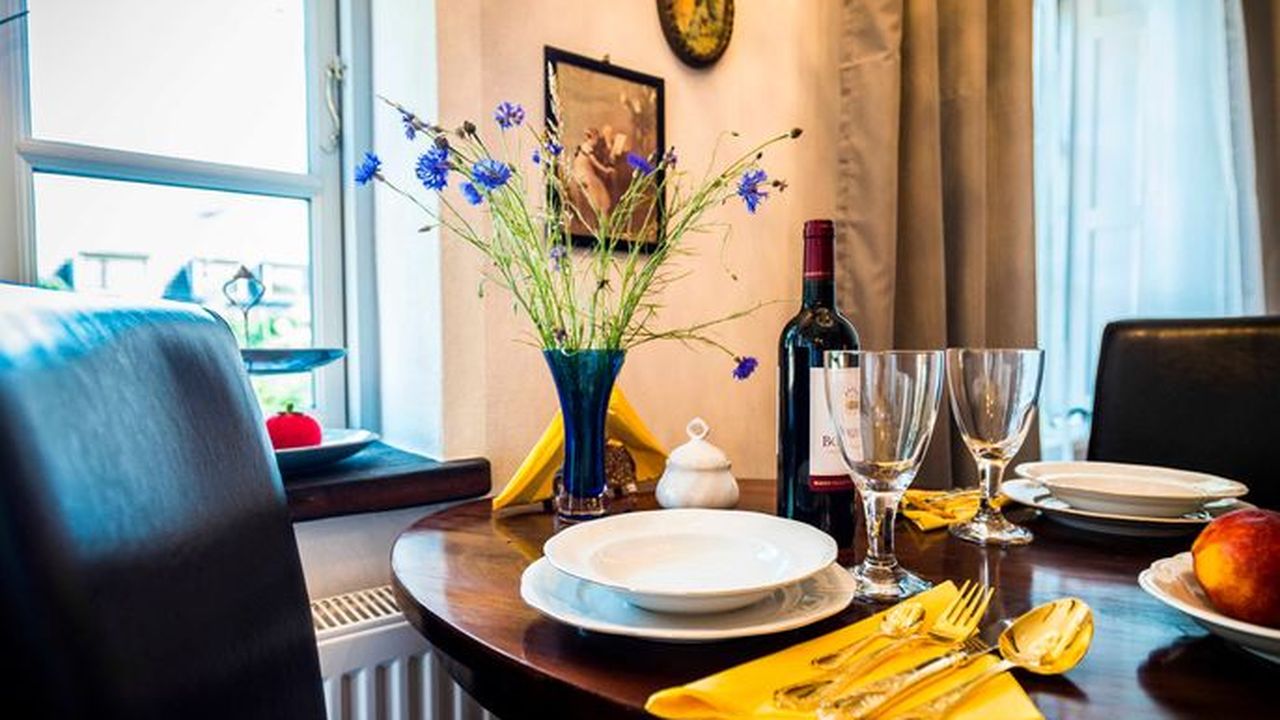 Der Parkplatz der Wohnung liegt unmittelbar vor der umzäunten Terrasse die mit Holzmöbeln und Kissen ausgestattet ist. Die ca. 42 m² große Wohnung erstreckt sich über 2 Etagen. Im EG der Wohnung befindet sich der Wohnraum mit Küche und Esstisch. Der Wohnraum hat einen abgetrennten Bereich für ein gemütliches Sofa mit Blick auf den 48 Flachbildfernseher. Eine Musikanlage mit CD-Player und USB-Anschluss sorgen für Unterhaltung und gemütliche Entspannung. Die Hochglanzeinbauküche läßt keine Wünsche offen. Sie umfasst Kühlschrank inkl. Gefrierfach, Spüle, Geschirrspüler, Vitrinen mit Geschirr und Gläsern, einen Herd mit Cerankochfeld und Tastbedienung, einen Backofen sowie zwei Unterschränke mit Schubladen. Die Küchenausstattung ist komplett mit Töpfen und Pfannen und allen zum Kochen notwendigen Utensilien wie: Kartoffelstampfer, Dosenöffner, Korkenzieher, Sparschäler, Mixstab, Kochlöffel, Knoblauchpresse, anständige Messer etc. Ein Kaffeevollautomat der Firma Saeco und ein Milchaufschäumer zaubern einen perfekten Latte Macchiato. Zusätzlich gibt es eine konventionelle Kaffeemaschine, einen Wasserkocher und Toaster. Das Geschirr und Besteck sind für 12 Personen damit der Geschirrspüler auch gefüttert werden kann. Außerdem gibt es Espressotassen, Michkaffeetassen, Müslischalen und zum Teil antike Servierschüsseln und Platten. Der Essbereich grenzt an die Küche. Über dem antiken Holztisch mit 2 Stühlen thront ein wunderschöner Kronleuchter mit 12 Leuchten, der stufenlos gedimmt werden kann. Die Wohnung erstreckt sich über zwei Etagen. In die 1. Etage führt eine Holztreppe in einen kleinen Flur mit einer Kommode mit viel Stauraum und antikem Spiegel. Von hier aus geht es in das Bad und das Schlafzimmer. Das Badezimmer mit grauen Hochglanzfliesen ist ausgestattet mit einer Badewanne und Regendusche, einem Waschtisch mit zwei Schubladen, einem großen Spiegel mit zwei zusätzlichen Leuchten und einem Handtuchheizkörper. Es liegt ein Föhn mit Diffuser bereit sowie pro Person ein Bade- und ein Handtuch. Das Schlafzimmer ist ausgestattet mit einem Doppelbett (160 x 200) mit einer wundervoll dicken Matratze, jede Bettseite hat einen Nachttisch mit einer Lampe und davor einem runden Teppich. Neben dem Kleiderschrank mit Spiegeltüren und Innenbeleuchtung steht eine kleine antike Kommode. Eine nostalgische Glasschale, eine zusätzliche Tischlampe mit gedimmten Licht und ein antikes Bild sorgen für nostalgische Atmosphäre.Schlafzimmer mit Verdunkelungsrollo.