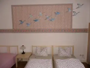 Gelegen im 2. Obergeschoss bieten wir Ihnen eine 3 - Raumwohnung mit vollausgestatteter Küche, einem Bad mit Wanne und einem Balkon. Die Wohnungsgröße beträgt 86 m² und ist für 3-9 Personen geeignet. Ein Großteil der Wänder wurde durch einen ansässigen Künstler mit tollen Malereien verschönert.