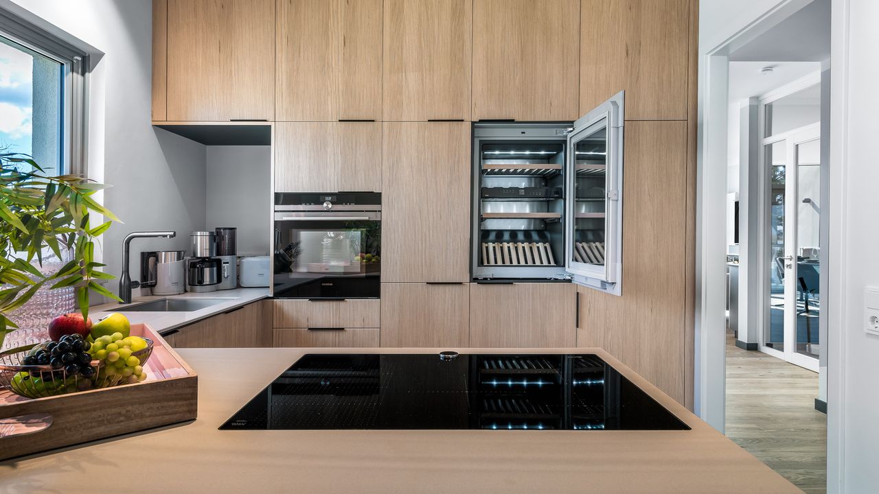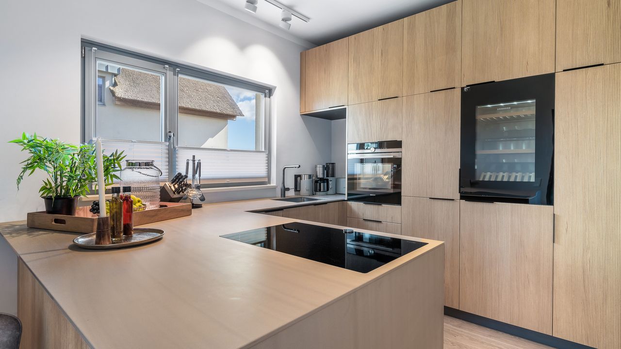 In der vollausgestatteten Design-Einbauküche verfügen Sie neben einem großen Kühlschrank über einen separaten Gefrierschrank und einen Weinkühlschrank, sowie über Backofen und großes Ceranfeld. Die edlen Materialien laden zum gemeinsamen Kochen ein und der ebenfalls vom Tischler gefertigte Esstisch beherbergt ganz bequem 8 Erwachsene zum festlichen Mahl.