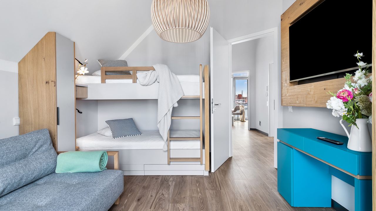 3. Zimmer: 1 Einbau-Hochbett mit 2 Liegeflächen á 90*200cm und 1 Ausziehcouch mit 2 zusätzlichen Schlafplätzen und einer Liegefläche von 155x200cm