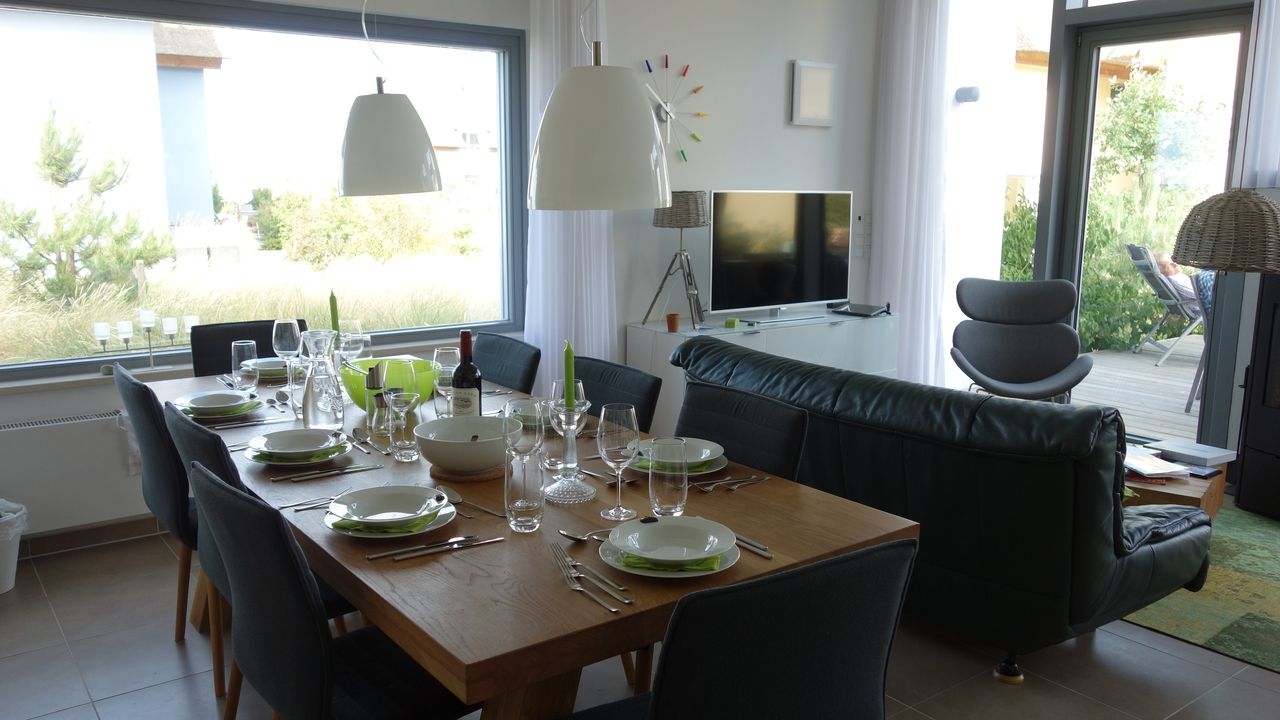 Heiligenhafen ist ein typisches kleines schleswig-holsteinisches Küstenstädtchen, das sich in seinem historischen Kern den Charme eines alten Fischerortes mit bäuerlichem Umfeld erhalten hat. Mit diesem beschaulichen Städtchen im Rücken liegt unser Haus in erster Meereslinie zwischen Jachthafen und Strand.Beim Biss ins knackige Frühstücksbrötchen blickt man aufs Meer, wenn man von seiner Ferienlektüre aufschaut, glitzert das Wasser und wenn man abends auf dem Balkon steht, schweift der Blick weit über die Wellen. Das Haus ist modern eingerichtete, wobei die massiven Eichenplatten der Tische im Wohn-Esszimmer einen Hauch wohnlicher Rustikalität verströmen. Wenn man dann abends in die Flammen des Kaminofens blickt, verliert das Wetter an Bedeutung und wem es immer noch nicht warm genug ist, der kann sich in der Sauna aufheizen.