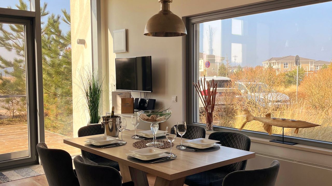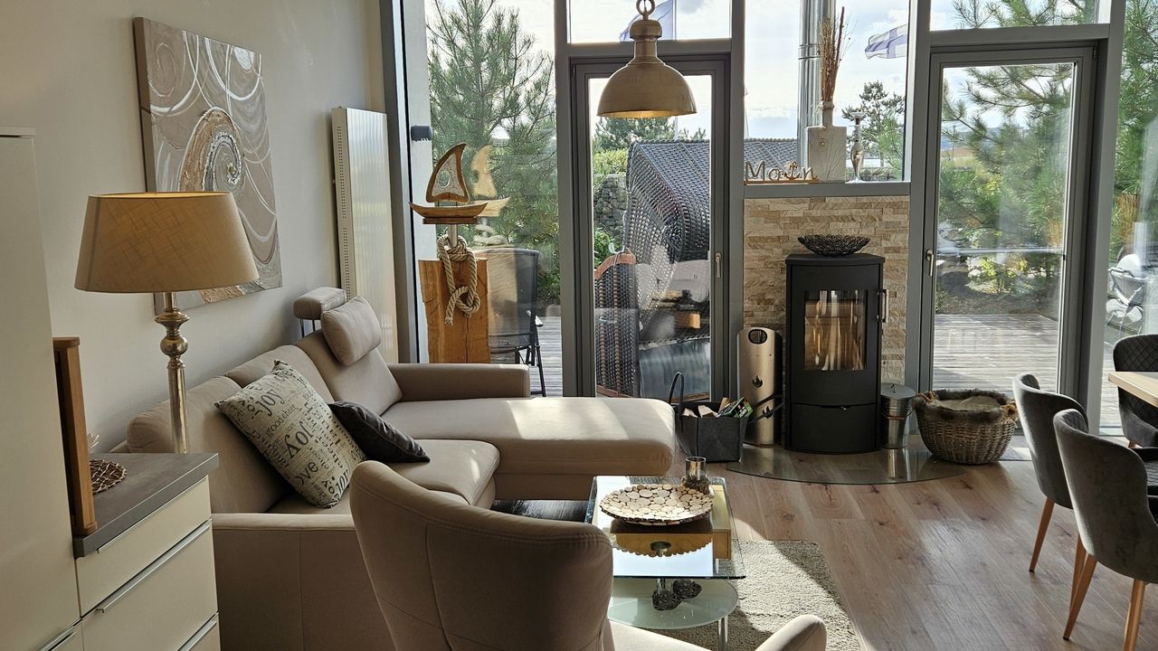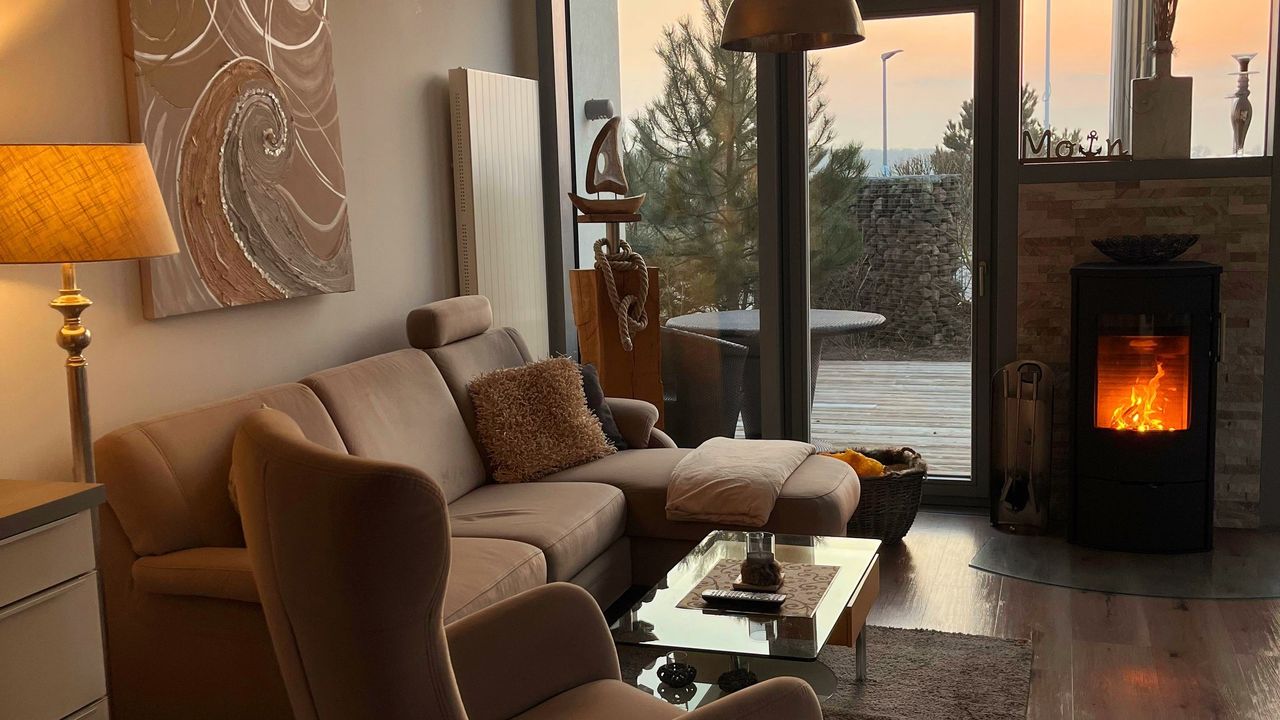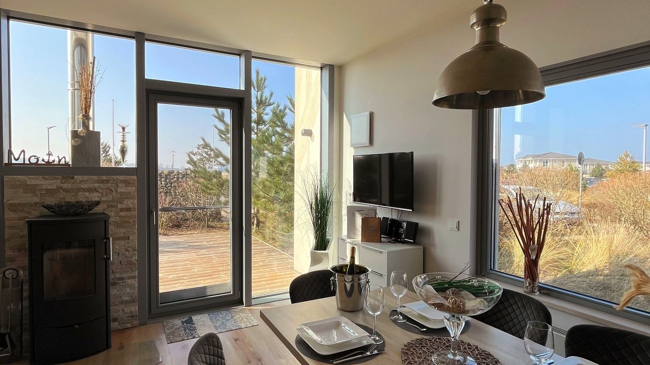 Exklusives, reetgedecktes Ferienhaus mit direktem Blick auf den Binnensee am Yachthafen in Heiligenhafen. Es erwartet Sie ein hochwertiges, neu erbautes (2016) 111 qm großes Feriendomizil für max. 6 Personen. Das Ferienhaus verfügt über eine Diele, ein Wohn-/Esszimmer mit Kamin und moderner Küche, zwei separate Schlafzimmer, ein zusätzliches Schlaf/Ruhezimmer im EG, zwei Bäder sowie einen Saunabereich. Die Ostterrasse ist umgeben von einer Dünenlandschaft, an das Wohnzimmer schließt sich die Süd-/Westterrasse mit freiem Blick auf den Binnensee an.Im Erdgeschoss befindet sich eine Diele wie auch das gemütliche Wohnzimmer mit Kamin, internetfähigem Flat Screen TV und Stereoanlage. In der angrenzenden, offenen Küche, die mit modernen Geräten (Backofen, Mikrowelle, Kaffeemaschine, Geschirrspüler,) ausgestattet ist, sollte es an nichts fehlen. Am großen Esszimmertisch finden 6 Personen Platz. Ebenso befindet sich neben einem Abstellraum eine finnische Sauna mit bodengleicher Dusche und ein Gäste-WC. Im angrenzenden Relax-Raum können Sie sich entspannen. Aus dem Wohnzimmer gelangen Sie auf die große, möblierte Süd-/Westterrasse mit herrlichem Blick auf den Binnensee.