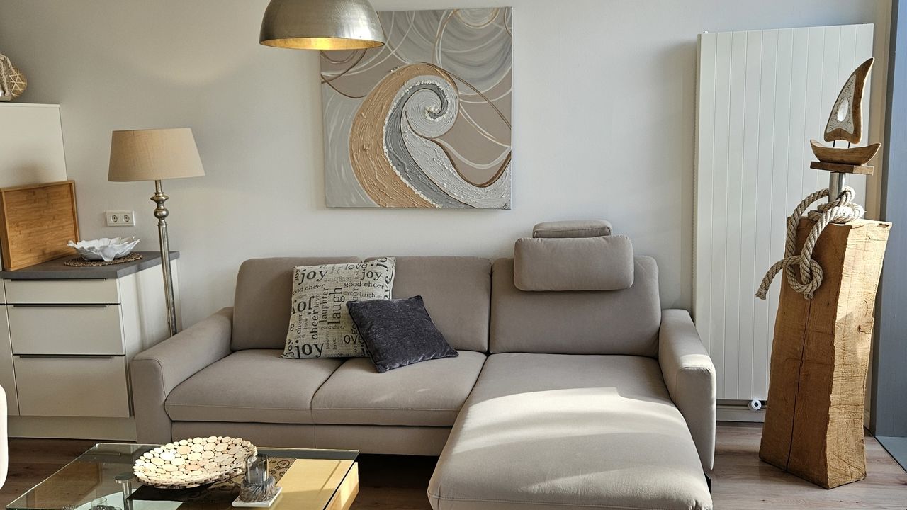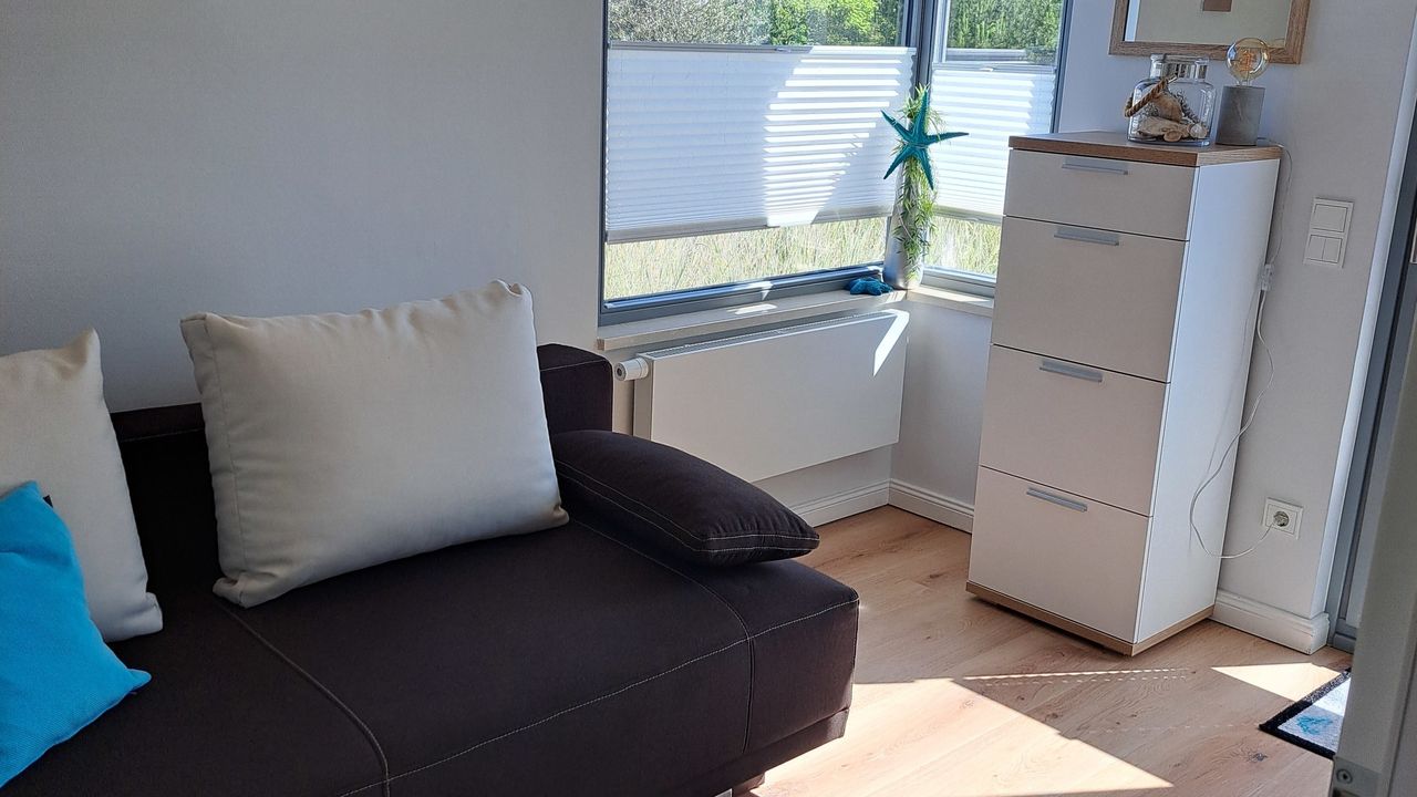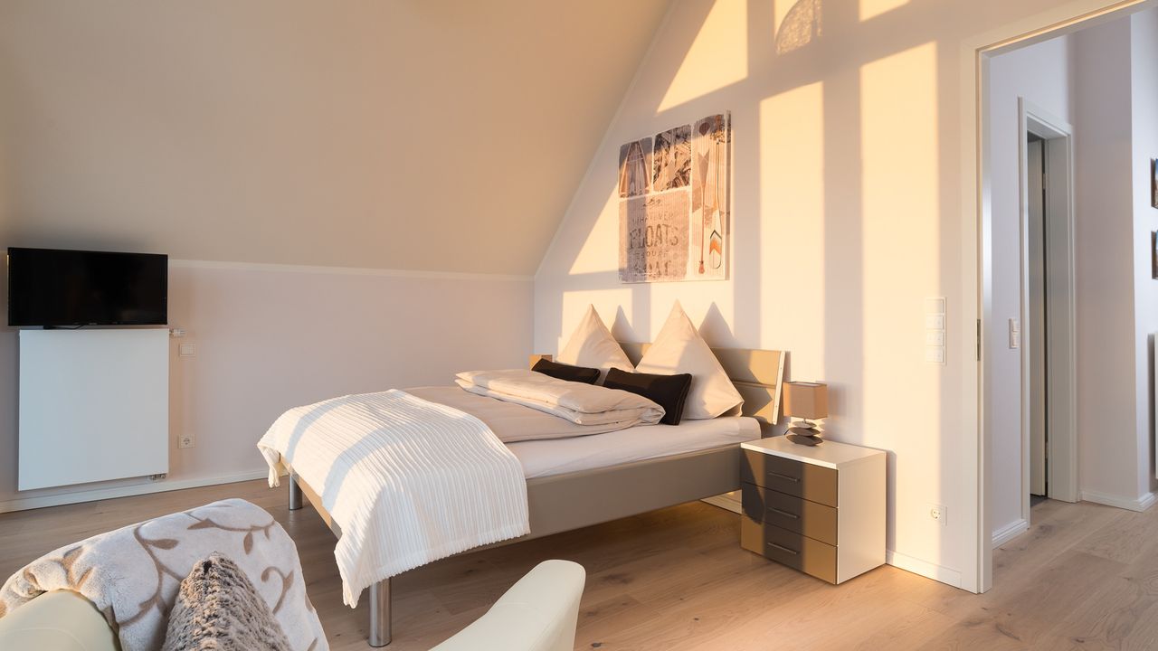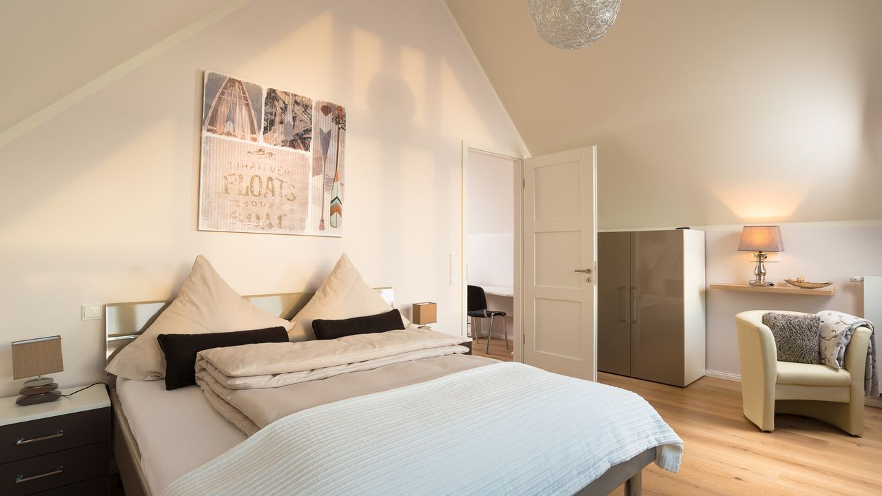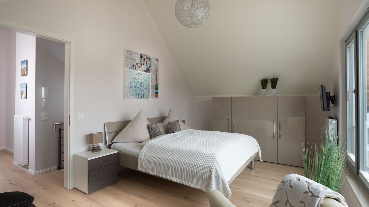 Zwei Schlafzimmer im Obergeschoss bieten Platz für 4 Personen. Alle Schlafzimmer sind mit Parkettfußboden ausgelegt. Das Schlafzimmer mit einmaligen Blick auf den Binnensee verfügt über ein Doppelbett (180/200), bodentiefen Fenstern und Flat Screen TV. Das zweite Schlafzimmer verfügt über ein Doppelbett (180/200),einen Flat Screen TV und einer großen Fensterfront, die einen großzügigen Blick in die Dünenlandschaft erlaubt. Das dritte Zimmer im Erdgeschoss verfügt über eine moderne Schlafcouch für 2 Personen (144/202).