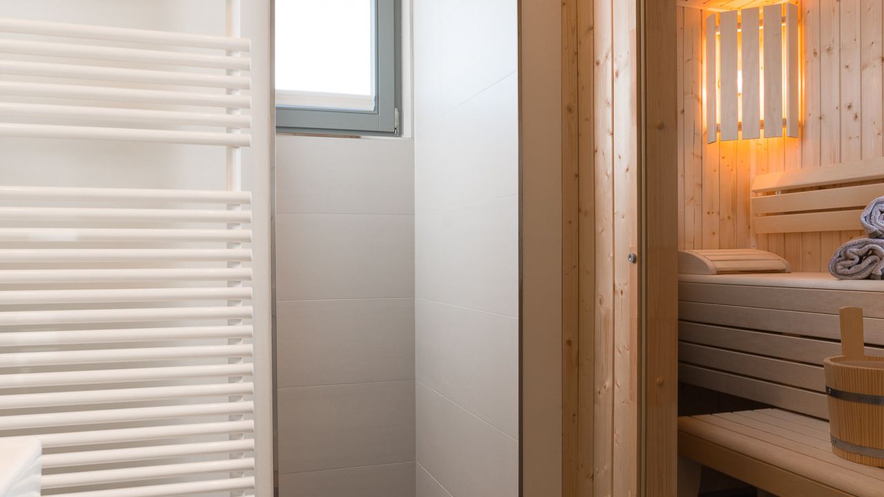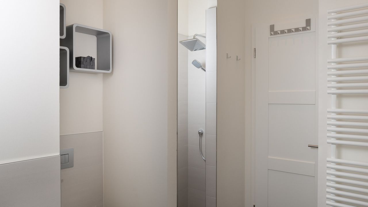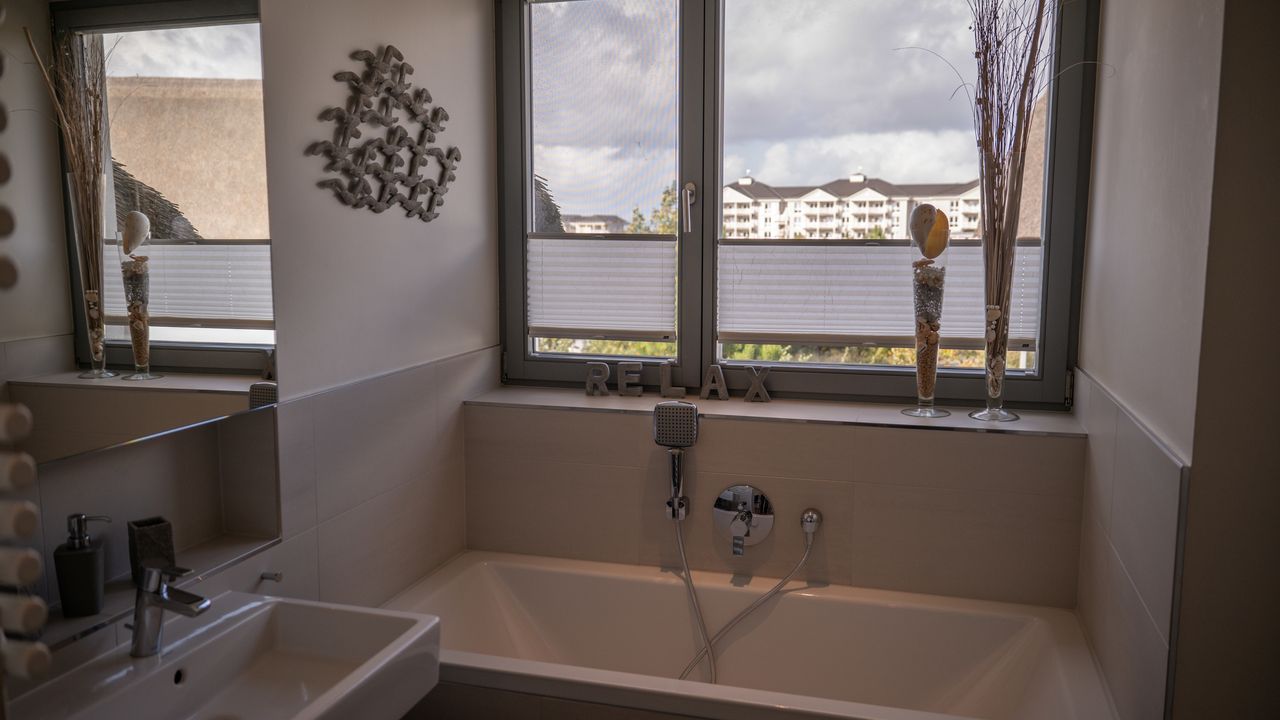 Vom Badezimmer mit bodengleicher Dusche, großem Waschtisch und Badewanne haben Sie einen schönen Blick auf die Ostsee. Außerdem befindet sich dort in einer separaten Ecke eine Waschmaschine.