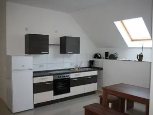 Das Wohnzimmer ist hell und mit TV sowie Sitzgarnitur eingerichtet. Die Küche grenzt unmittelbar an den Wohnbereich an, ist jedoch durch eine Wand vom Wohnraum abgetrennt. Der Küchenbereich ist ebenfalls im modernen Design eingerichtet. Backofen, Herd, Kaffeemaschine etc. sind vorhanden und bieten alles, was Sie für Ihre Eigenversorgung brauchen. Ein schöner Essplatz steht natürlich auch für Sie bereit.