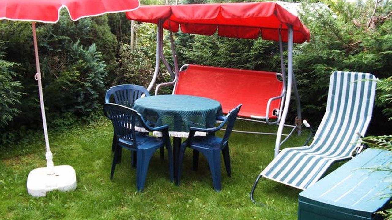 Vor der Wohnung gibt es einen Parkplatz für das Auto und im Garten einen eigenen durch Sichtschutzhecken abgetrennten Bereich mit Gartenmöbeln.