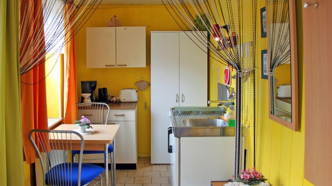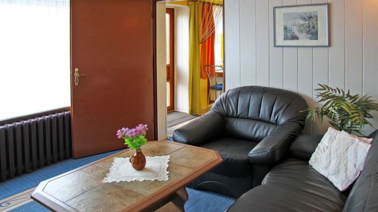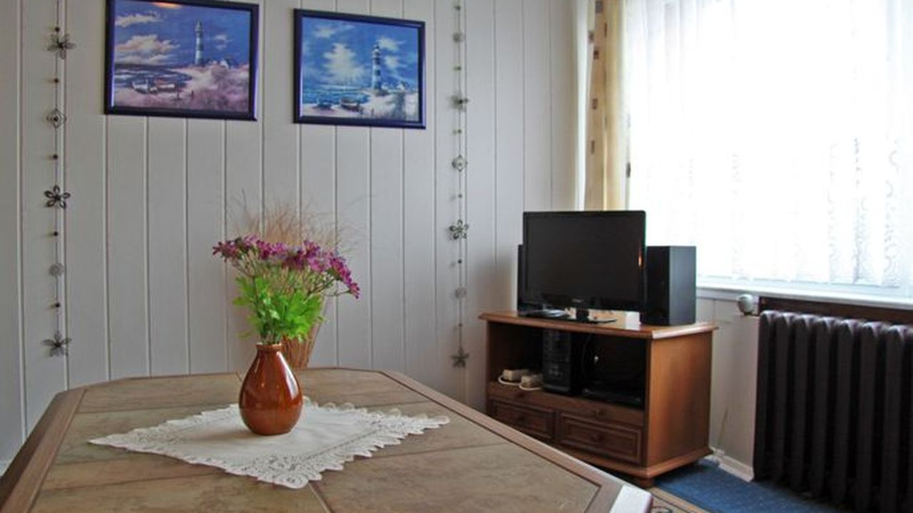 In der kleineren Ferienwohnung befinden sich auf 40 m² ein gemütliches Wohnzimmer mit Sitzecke und Sat-TV, Doppelbett-Schlafzimmer, voll ausgestattetem Küchenbereich und Dusche/WC.