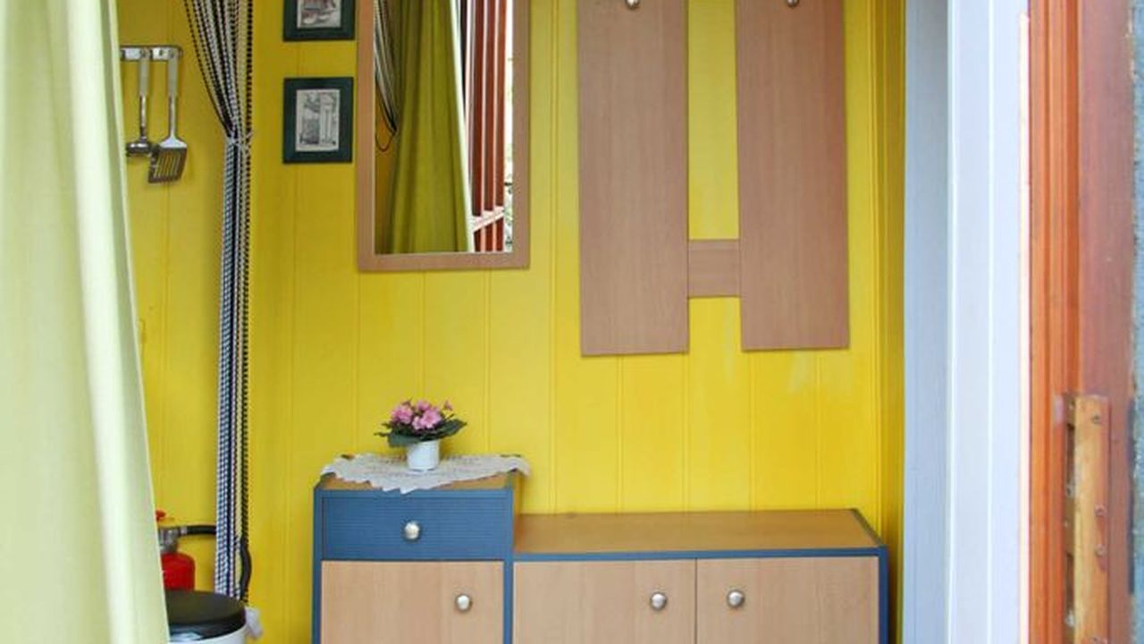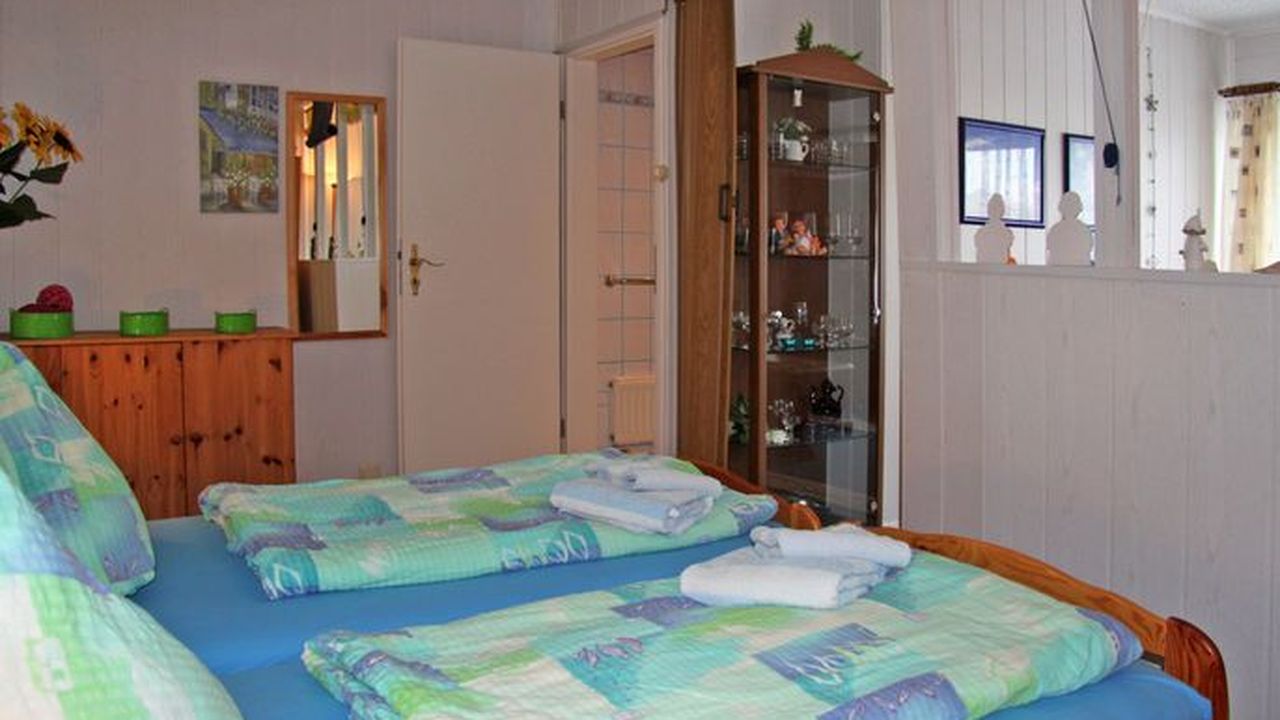 Ein Schlafzimmer ist mit einem Doppelbett und das andere Schlafzimmer mit einem Etagenbett (Doppelstockbett) für Kinder und Junggebliebene ausgestattet. Über das Kinderschlafzimmer gelangt man in das Bad.