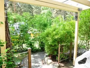 1 überdachte Terrasse mit Gartenmöbeln und kleinem Garten