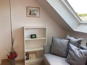 Kurzbeschreibung:Unsere Dachgeschoßwohnung mit großer Loggia besteht aus 1 Schlafzimmer mit Doppel- u.Einzelbett,Couch ,Eßt. und Loggiazimmer: 2 Schlafcouchen à1,40 x 2,00) , Esstisch ,TV,