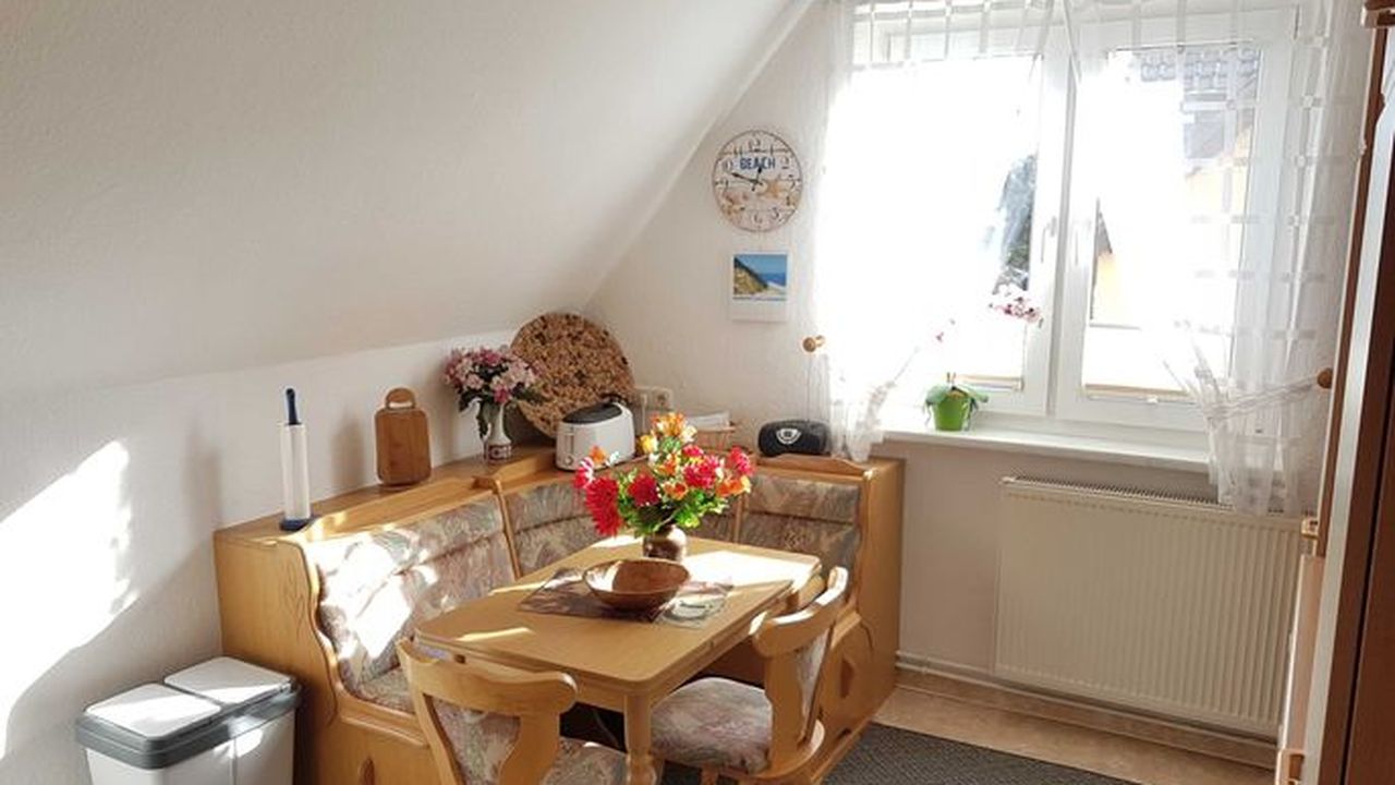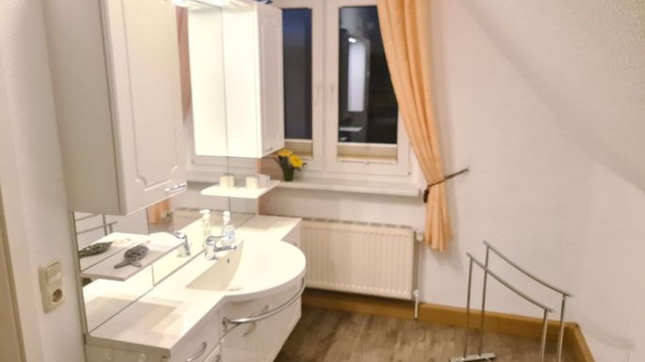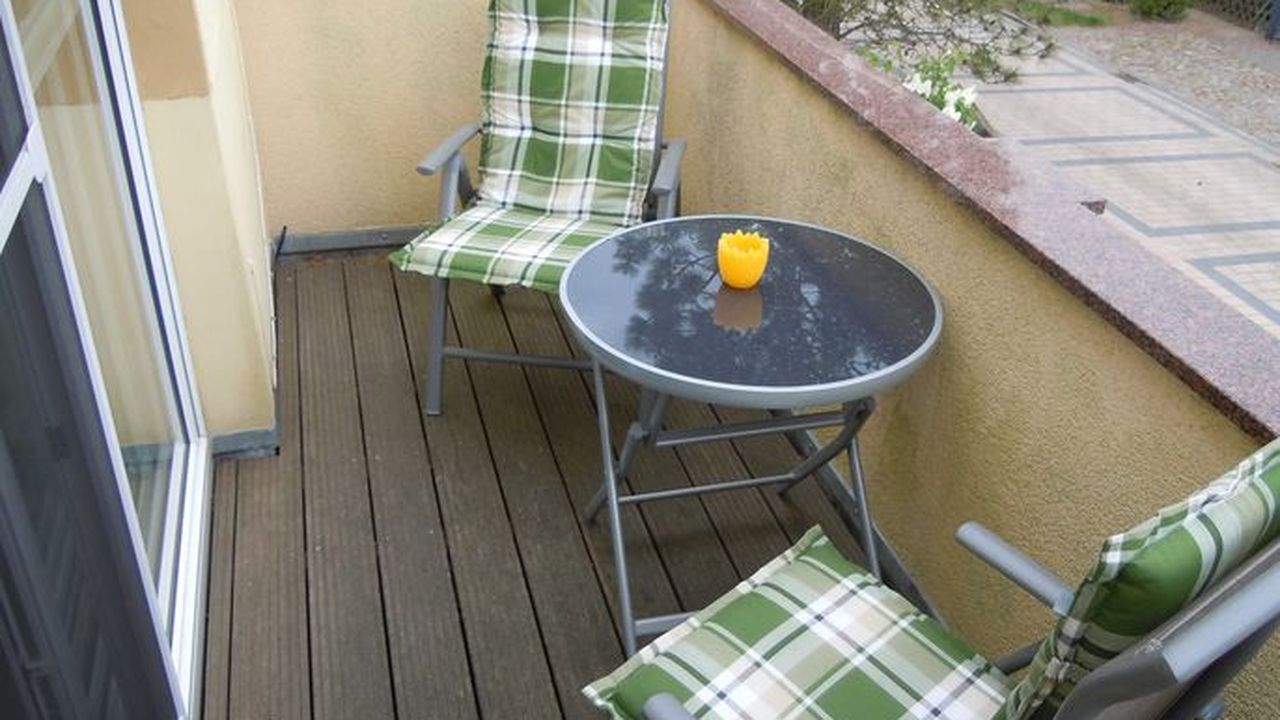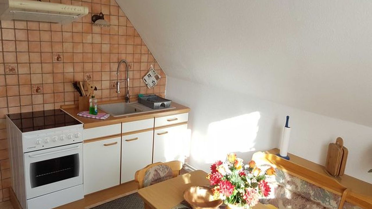 Die Ferienwohnung (für bis zu 4 Personen + 1 Kleinkind im zusätzlichen Reisebett) befindet sich im 1.OG des Eigenheims. Hier können Sie im Flur Ihre Schuhe und alltägliche Garderobe ablegen. Vom Treppenflur aus kommen Sie ins Bad, in die Küche oder ins angrenzende Wohnzimmer. Das Bad ist mit Dusche und WC ausgestattet. Die nebenliegende große Küche bietet Ihnen einen Herd mit Ceranfeld und Dunstabzug, einen großen Kühlschrank mit Gefrierfächern, einen Geschirrspüler, eine Mikrowelle, Kaffeemaschine, Toaster und mehrere Abstellmöglichkeiten und Schränke mit Geschirr/Kochgeschirr sowie Haushaltsutensilien. Zur Unterhaltung haben Sie hier ein Radio. Zum Entspannen ist das gemütliche Wohnzimmer, in welches Sie wieder über den Treppenflur gelangen. Hier können Sie ungestört TV-Sendungen sehen oder einfach relaxen und ein spannendes Buch lesen. Hier im Wohnzimmer erfolgt die Aufbettung für 2 Personen auf der ausziehbaren Schlafcouch. Im angrenzenden Schlafzimmer mit Doppelbett finden Sie genügend Platz für Ihre Garderobe. Die Nachmittags- und Abendsonne genießen Sie auf dem Balkon, ausgestattet (Mai-Oktober) mit Tisch, Stühlen und Sonnenschirm.