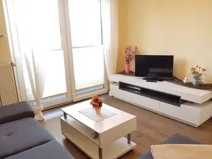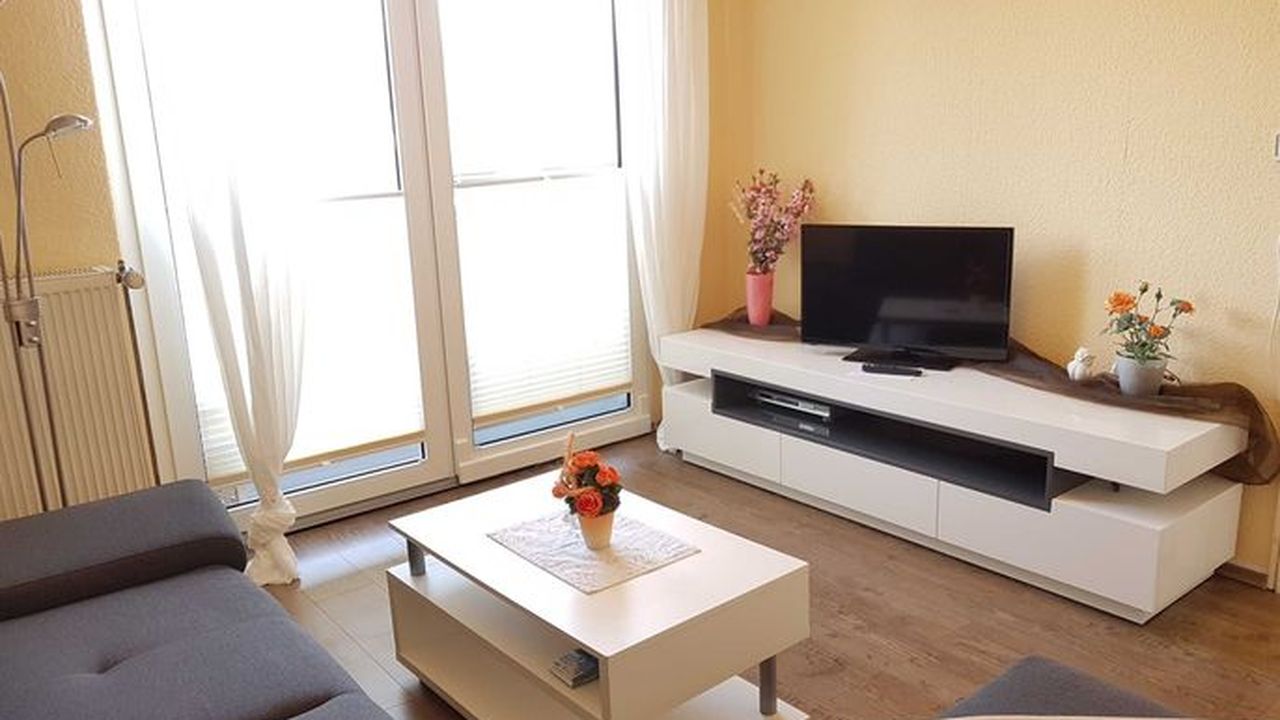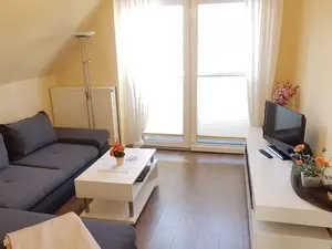 • 1 Wohnzimmer mit Schlafcouch (2x Aufbettung ca. 1,60m x 2,10m), Flat-TV und Zugang zum Balkon