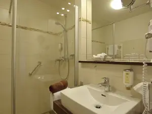 Bad mit ebenerdig begehbarer Dusche, WC, Haartrockner