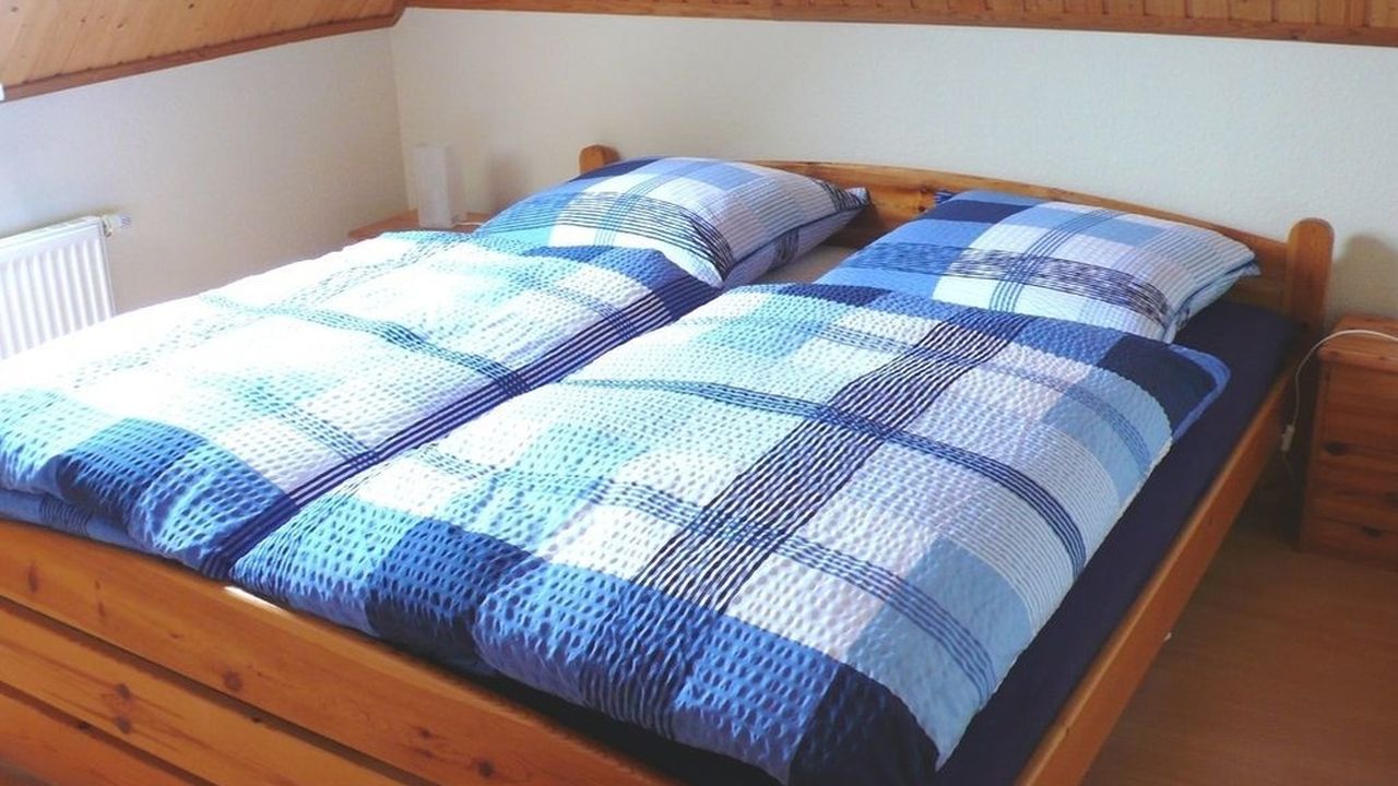 Das separate Schlafzimmer verfügt über ein Doppelbett mit höhenverstellbaren Lattenrosten. Im Wohnzimmer finden auf einer Schlafcouch (140x200) und einer Klappmatratze bei Bedarf weitere Gäste Platz. Der komplette Wohn- und Schlafbereich ist mit Laminat ausgestattet und somit allergikerfreundlich.