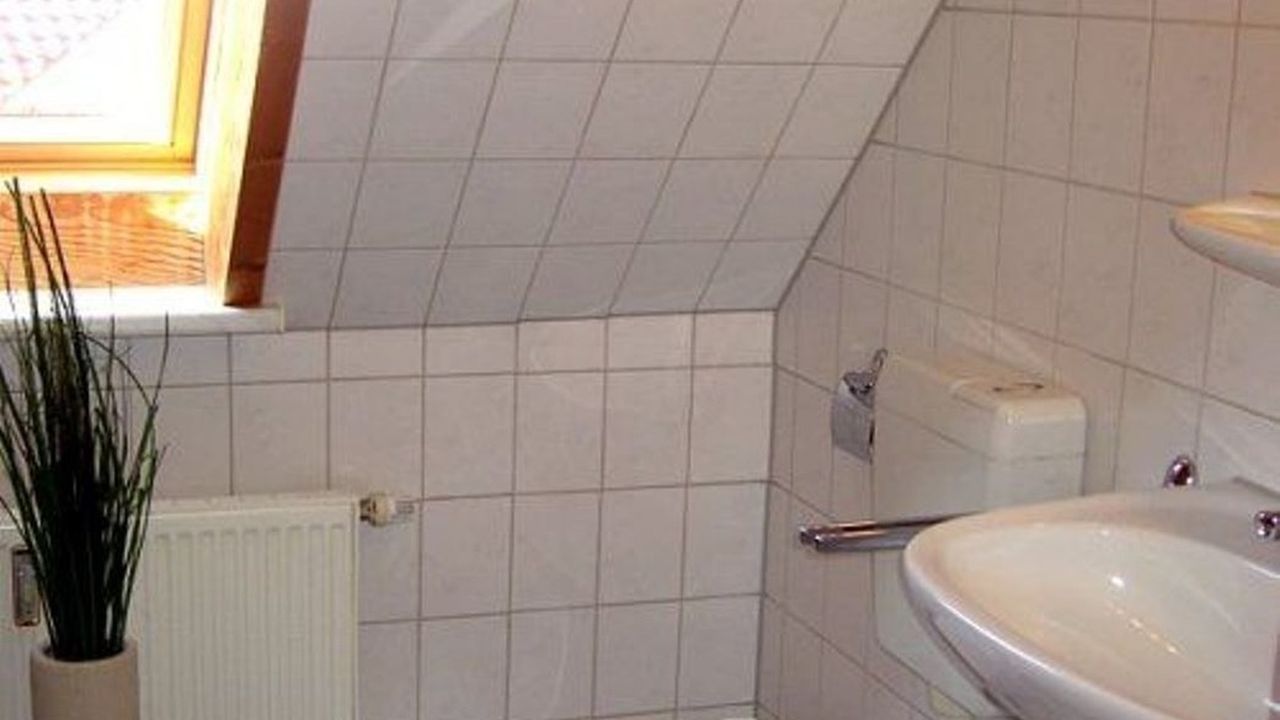 Das moderne Duschbad hat viel Platz für die Badutensilien und Handtücher. Ein Fön ist auch vorhanden.