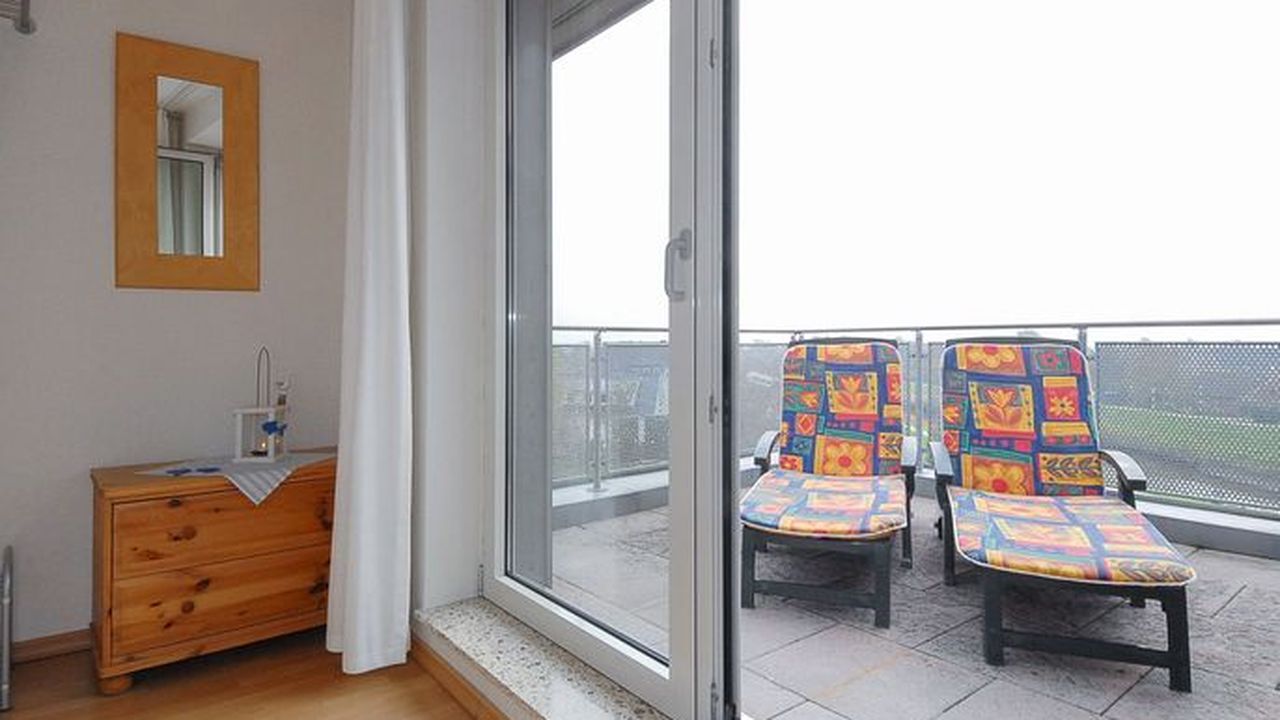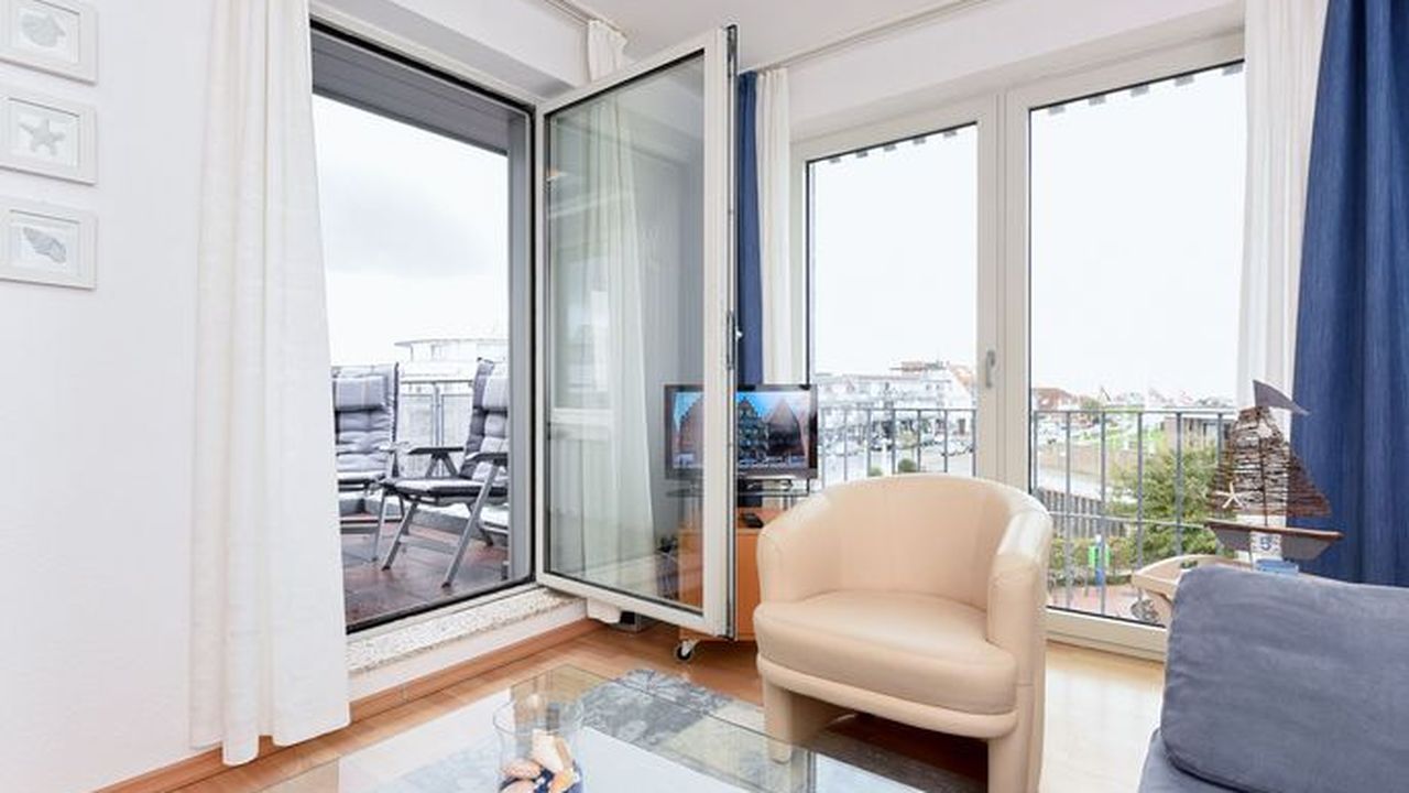 Die Wohnung „Lee“ verfügt über zwei Balkone. Einen in Richtung Westen mit Blick auf den Hafen und die Nordsee sowie einen in Richtung Süden mit Blick auf das Nordseeheilbad Bensersiel.