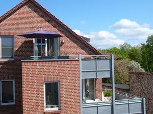 Auf dem ca. 10 qm großen Balkon kann gegrillt werden (Elektrogrill). Sonne hat man auf dem Süd-West-Balkon vom späten Vormittag bis abends. Der Balkon ist möbliert mit bequemen Korbsesseln. Zwei verstellbare Hochlehner sind außerdem vorhanden. Hier kann man den Blick über das Salzhaff ungestört geniessen. Da die Wohnung im 2. Stock liegt, hat man einen weiten Blick über das Salzhaff bis nach Wismar.