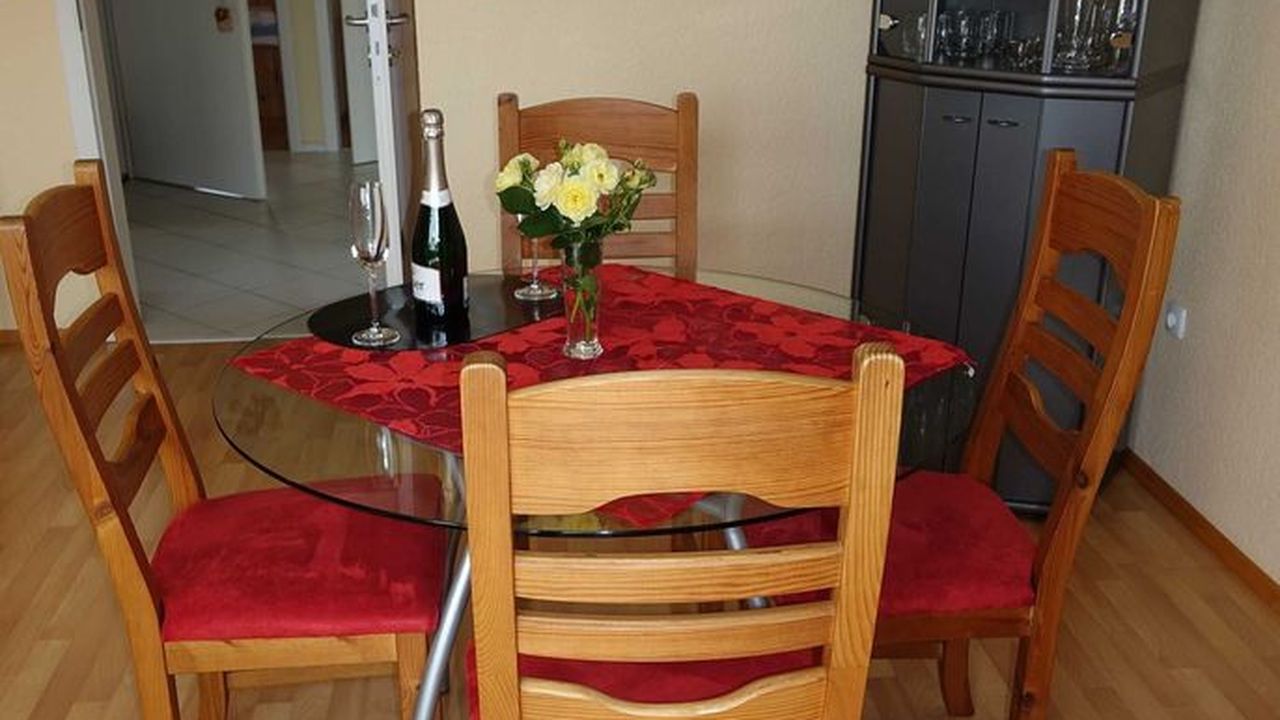 In frischen Farben ansprechend gestaltet befindet sich die Ferienwohnung Heike für bis zu 4 Personen im Obergeschoss eines Einfamilienhauses und verfügt über einen separaten Eingang. In der gesamten Wohnung ist der Bodenbelag in hellem Laminat gehalten.- offener Wohn- und Essbereich mit anliegendem Balkon in Südlage mit kleiner Sitzecke