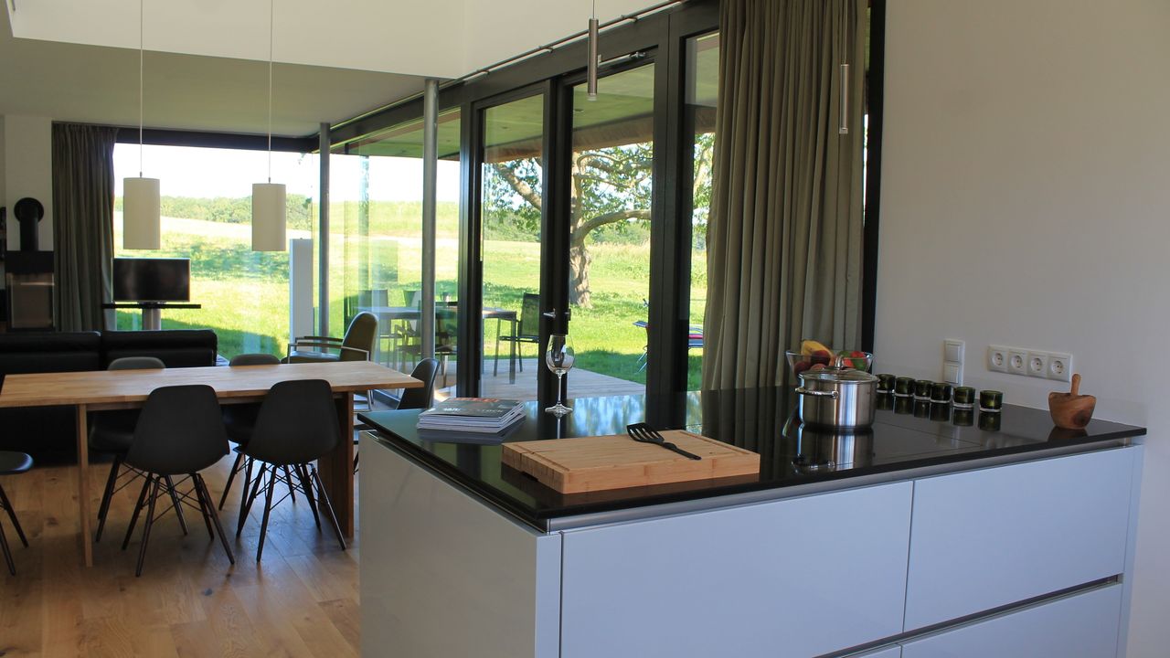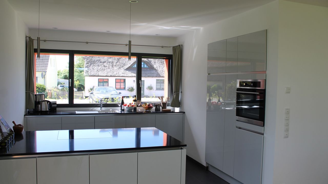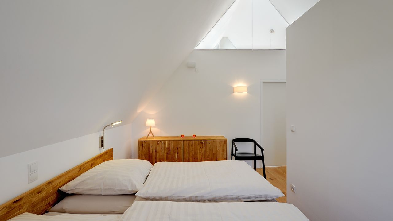 Hier unser Haus 2 mit zwei Schlafzimmer und drei Duschbädern. 4 Personen können hier einen ruhigen Urlaub verbringen, auf dieser Ansicht das vordere Gebäude. WLAN und Sauna können kostenlos genutzt werden.Das Projekt Wreechen 25 wurde von dem Berliner Architekten Norbert Möhring entworfen. Es handelt sich um 2 versetzte Einzelhäuser. Haus 1 mit drei Schlafzimmern und Haus 2 mit zwei Schlafzimmern. Die beiden Schlafzimmer im Dachgeschoss haben jeweils ein eigenes integriertes Duschbad. Die Küche ist sehr gut ausgestattet und läßt keine Wünsche offen. Über dem Esstisch befindet sich eine Empore mit Blick bis zu den großen Dachfenstern. Tagsüber sorgen diese Fenster für lichtdurchflutete Räüme, bei Dunkelheit sieht man bei entsprechender Wetterlage den Mond und die Sterne.