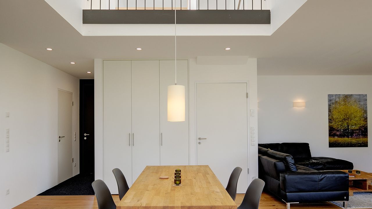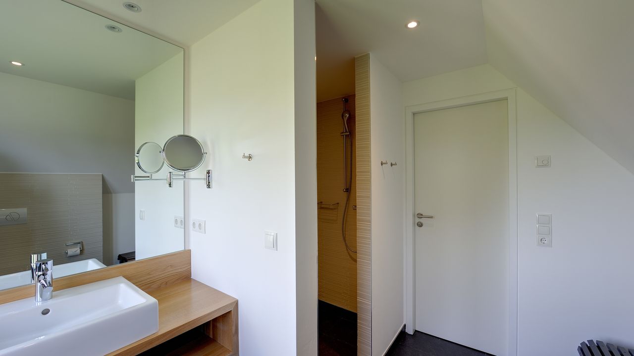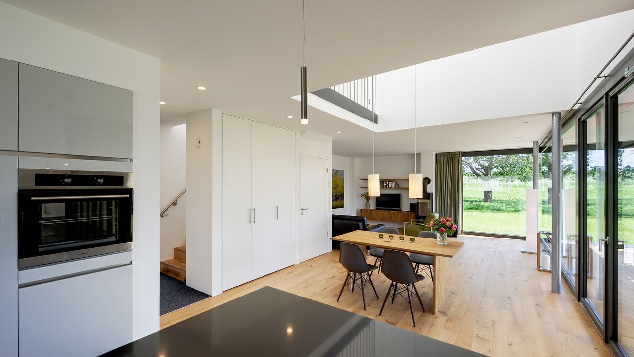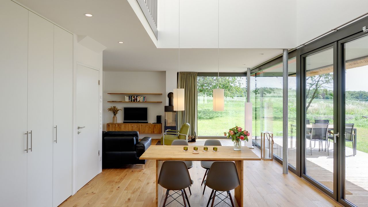 Hier unser Haus 2 mit zwei Schlafzimmer und drei Duschbädern. 4 Personen können hier einen ruhigen Urlaub verbringen, auf dieser Ansicht das vordere Gebäude. WLAN und Sauna können kostenlos genutzt werden.Das Projekt Wreechen 25 wurde von dem Berliner Architekten Norbert Möhring entworfen. Es handelt sich um 2 versetzte Einzelhäuser. Haus 1 mit drei Schlafzimmern und Haus 2 mit zwei Schlafzimmern. Die beiden Schlafzimmer im Dachgeschoss haben jeweils ein eigenes integriertes Duschbad. Die Küche ist sehr gut ausgestattet und läßt keine Wünsche offen. Über dem Esstisch befindet sich eine Empore mit Blick bis zu den großen Dachfenstern. Tagsüber sorgen diese Fenster für lichtdurchflutete Räüme, bei Dunkelheit sieht man bei entsprechender Wetterlage den Mond und die Sterne.