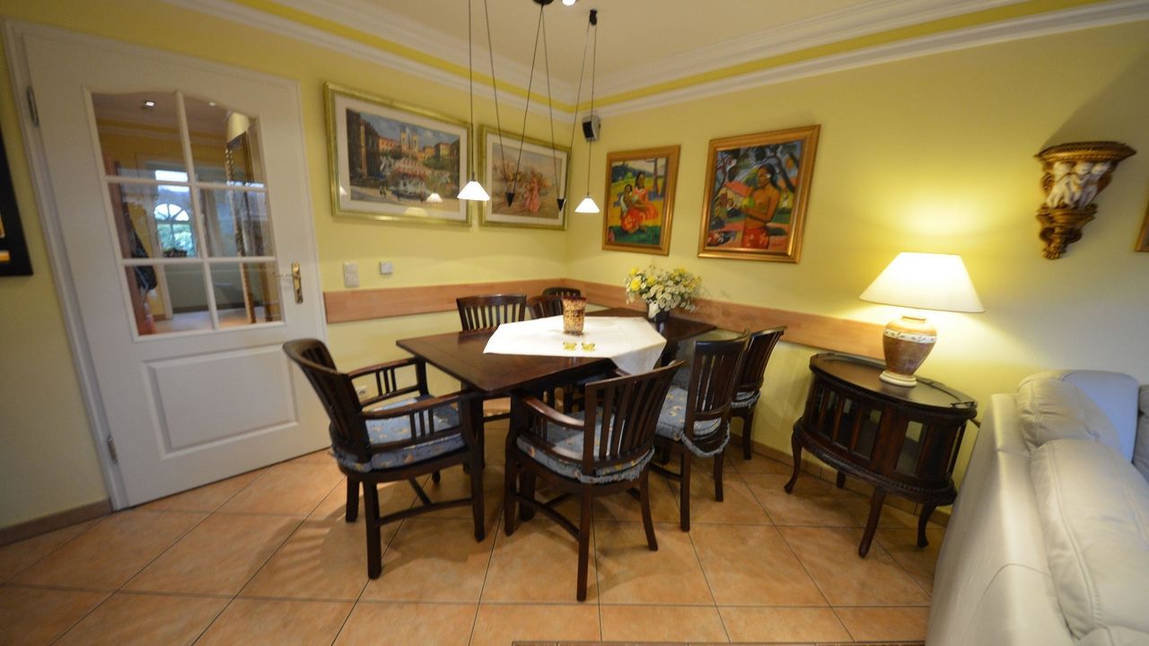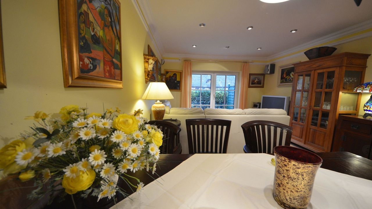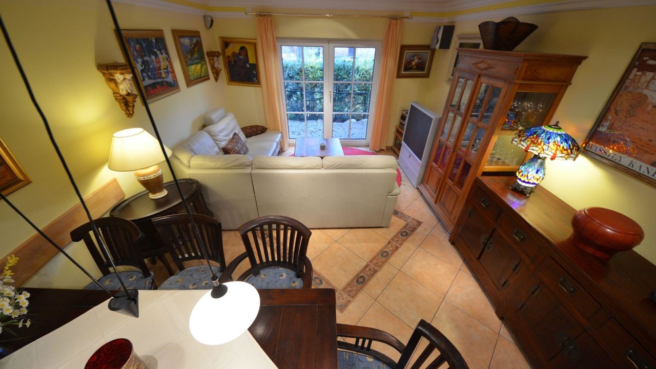 Wohn- Esszimmer mit Ausgang zur Terrasse mit Gartenmöbeln,