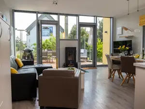 Den größten Raum der unteren Etage nimmt der modern eingerichtete Wohnbereich mit Küchenzeile ein. Ein großer Fernseher und Bluray-Player sind ebenso vorhanden wie Wasserkocher, Toaster, Kaffeemaschine, Nespressomaschine und ein elektrischer Handmixer sowie eine Mikrowelle.