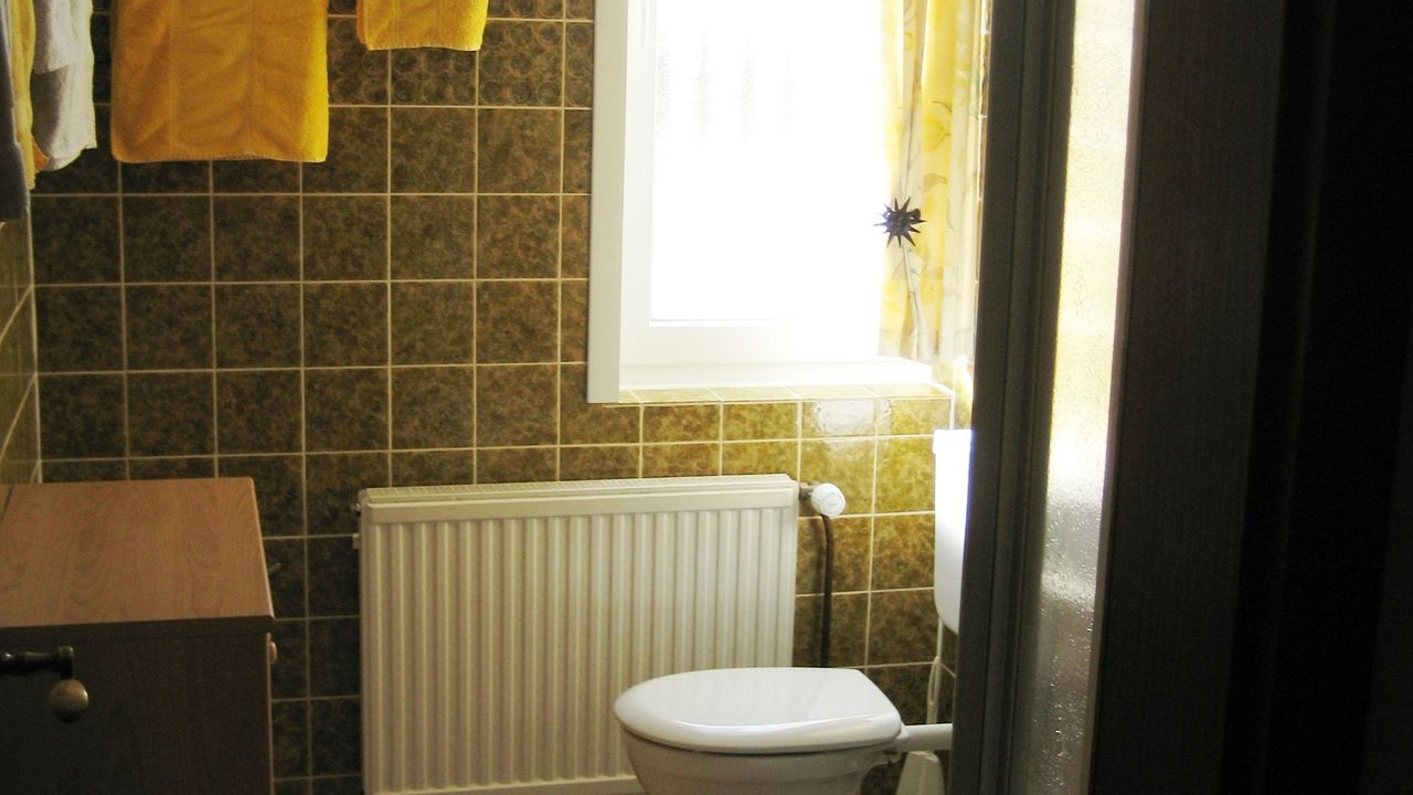 Im Bad sind Fön, Kosmetikspiegel und Handtücher