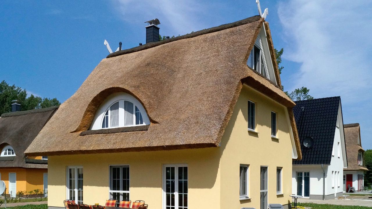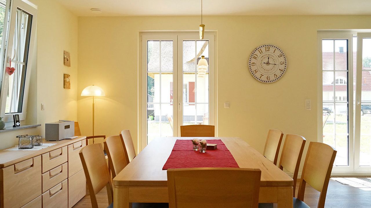 Das wunderschöne, großzügige Reetdachhaus "Bastians Reethus" liegt nahe dem Ostseestrand in der neu angelegten Ferienhaus-Siedlung Ostseepark Glowe in ruhiger Randlage auf einem 950 m² großen Grundstück. Bastians Reethus hat eine Wohnfläche von ca. 160 m² und ist modern und familienfreundlich eingerichtet.Im Erdgeschoss von Bastians Reethus befindet sich der großzügige Wohn- und Essbereich mit offener Küche und zwei angrenzenden Terrassen. Das Dachgeschoss verfügt über drei Schlafzimmer mit insgesamt sechs Betten für Erwachsene und zwei zusätzlichen Aufbettungen für Kleinkinder. Im ausgebauten Spitzboden befindet sich ein viertes Schlafzimmer mit vier weiteren Betten und einem Gäste-WC. Zwei Duschbäder - eines mit zusätzlicher Badewanne - stehen Ihnen während ihres Aufenthaltes im Erd- und Obergeschoss zur Verfügung.