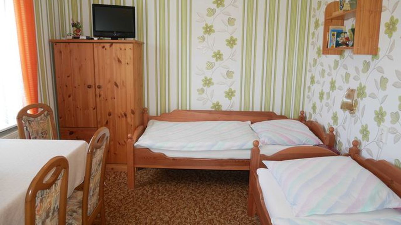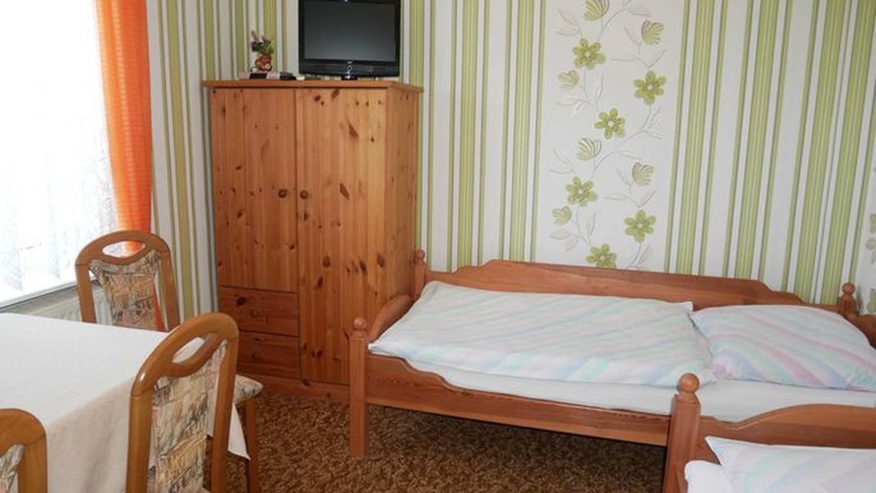 Schlafzimmer 1: Zwei Einzelbetten, kleiner Fernseher, Esstisch mit Sitzgelegenheiten