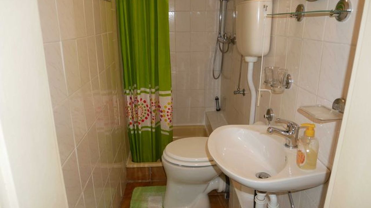 Badezimmer: Dusche mit Duschvorhang, WC und Waschbecken (über eine kleine Stufe erreichbar)